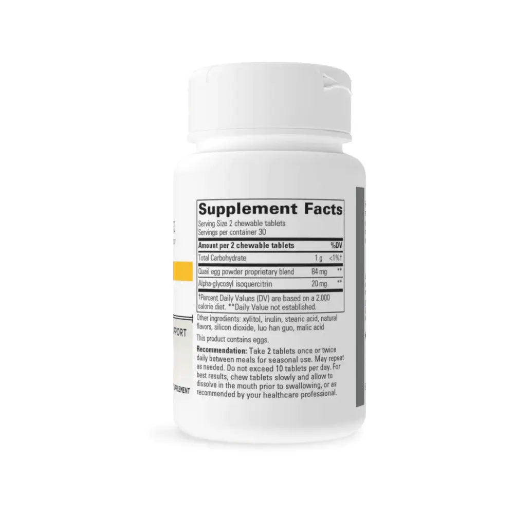 <ul><li>Schnell wirkende Wachtelformel für schnelle Unterstützung.<br></li><li>Unterstützt die Stabilität der Mastzellen und den Augenkomfort.<br></li><li>Geeignet für den saisonalen und ganzjährigen Gebrauch.<br></li><li>Enthält AGI, eine schnell absorbierbare Form von Quercetin.<br></li><li>Beerenaromatisches, bequemes Kautablette.</li></ul>
