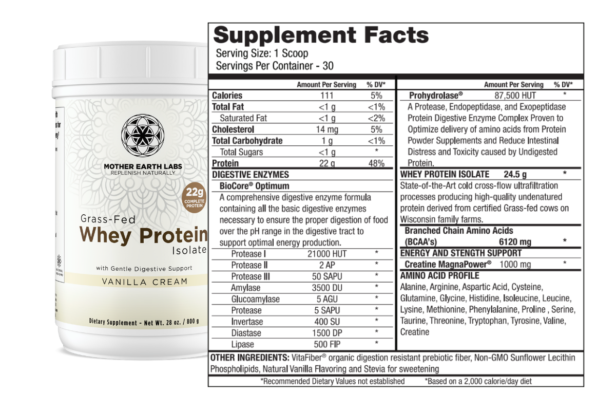 <p>Isolat de protéines de lactosérum nourri à l'herbe (saveur vanille) est conçu pour aider à fournir rapidement les acides aminés dont votre corps a besoin.<br data-mce-fragment='1'><br data-mce-fragment='1'>• 24 g de protéines par portion<br data-mce-fragment='1'>• Protéine pure facilement digestible nourrie à l'herbe<br data-mce-fragment='1'>• Avec des enzymes digestives<br data-mce-fragment='1'>• Sans danger pour les enfants<br data-mce-fragment='1'><br data-mce-fragment='1'>La protéine est un macronutriment clé. Les laboratoires Mother Earth Whey Protein sont fournis avec un mélange d'enzymes hautement efficace, testé par des tiers, appelé Prohydrolase®.</p><p><br></p><p>Plus d'informations sur ce produit</p><p><br></p><p>Malheureusement, en raison de la législation sur les compléments alimentaires, nous ne sommes pas autorisés à fournir des informations (complètes) sur ce produit. Pour plus d'informations, nous vous renvoyons à une bibliothèque de médecine</p>