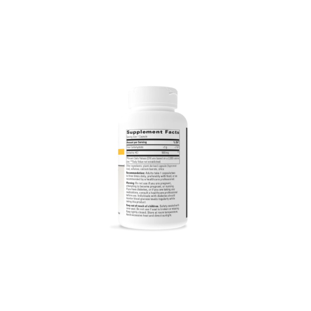 <table align='center' border='1' cellpadding='3' cellspacing='0'> <tbody> <tr valign='top'> <td colspan='3'><b>Voedingsinformatie: Voedingssupplement</b></td> </tr> <tr valign='top'> <td colspan='3'><strong>Portiegrootte: </strong>1 capsule</td> </tr> <tr valign='top'> <td width='70%'></td> <td width='15%'>Hoeveelheid per portie</td> <td width='15%'>% RI*</td> </tr> <tr> <td>Berberine HCl</td> <td>500 mg</td> <td>†</td> </tr> <tr> <td>Totaal koolhydraten</td> <td><1 g</td> <td><1%</td> </tr> <tr valign='top'> <td colspan='3'>* Referentie-inname gebaseerd op een dieet van 2.000 calorieën. † Referentie-inname niet vastgesteld.</td> </tr> </tbody></table><h3>Ingrediënten</h3><p>Berberine HCl, Plantaardige capsule (hypromellose), Cellulose, Calciumlauraat, Siliciumdioxide</p><h3 class=''>Bevat geen:</h3><p>gluten, tarwe, soja, maïs, zuivel, kleurstoffen of kunstmatige smaakstoffen.</p>