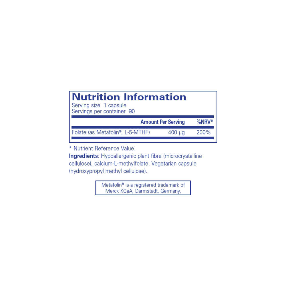 <table align='center' border='1' cellpadding='3' cellspacing='0'> <tbody> <tr align='left' valign='top'> <td colspan='3'><p><b>Voedingswaarde: Voedingssupplement</b></p></td></tr> <tr align='left' valign='top'> <td colspan='3'><strong>Porties Per Verpakking:</strong> 90</td> </tr> <tr align='left' valign='top'> <td width='70%'>&nbsp;</td> <td width='15%'>Hoeveelheid per portie:</td> <td width='15%'>% NRV*</td> </tr> <tr align='left' valign='top'> <td>Folaat (Metafolin, L-5-MTHF)</td> <td>400 µg</td> <td>†</td> </tr> <tr align='left' valign='top'> <td colspan='3'> <p>*Nutriënten Referentie Waarde</p> <p>†NRV niet vastgesteld.</p> </td> </tr> </tbody></table><h3>Ingrediënten</h3><p>Hypoallergene plantenvezel (microkristallijne cellulose), calcium-L-methylfolaat. Vegetarische capsule (hydroxypropylmethylcellulose).</p>