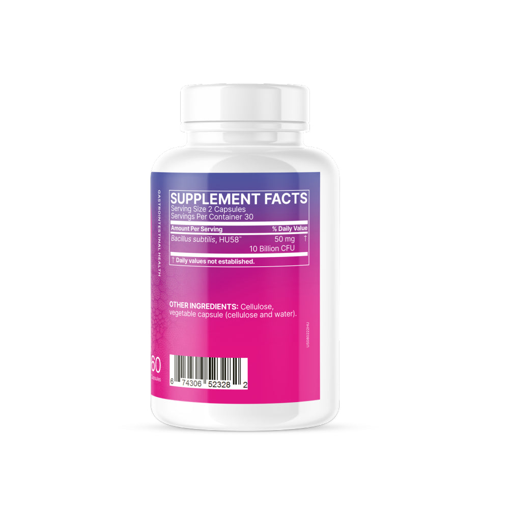 <table align='center' border='1' cellpadding='3' cellspacing='0'> <tbody> <tr> <td colspan='3'><strong>Voedingsinformatie: Voedingssupplement</strong></td> </tr> <tr> <td colspan='3'><strong>Portiegrootte: </strong>2</td> </tr> <tr> <td colspan='3'><strong>Porties Per Verpakking:</strong> 30</td> </tr> <tr> <td width='70%'></td> <td width='15%'>Hoeveelheid Per Portie</td> <td width='15%'>% RI**</td> </tr> <tr> <td>Probiotische Sporebacteriën - Bacillus subtilis HU58</td> <td>30 mg</td> <td>†</td> </tr> <tr> <td colspan='3'>† Referentie-inname niet vastgesteld.</td> </tr> </tbody></table><h3>Ingrediënten</h3><p>Probiotische Sporebacteriën - Bacillus subtilis HU58, farmaceutische cellulose, plantaardige capsule (hydroxypropylmethylcellulose).</p>