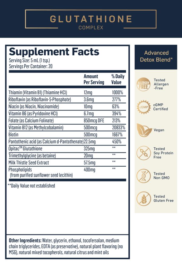 <table align='center' border='1' cellpadding='3' cellspacing='0'> <tbody> <tr align='left' valign='top'> <td colspan='3'><strong>Voedingsinformatie: Voedingssupplement</strong></td> </tr> <tr align='left' valign='top'> <td colspan='3'><strong>Serveergrootte:</strong> 5ml </td> </tr> <tr align='left' valign='top'> <td colspan='3'><strong>Porties Per Verpakking:</strong> 20</td> </tr> <tr align='left' valign='top'> <td width='70%'> </td> <td width='15%'>Hoeveelheid Per Portie</td> <td width='15%'>% Referentie-Inname</td> </tr> <tr> <td>Fosfolipiden (uit gezuiverde zonnebloemzaadlecithine)</td> <td>400 mg</td> <td>†</td> </tr> <tr> <td>Opitac Glutathion</td> <td>325 mg</td> <td>†</td> </tr> <tr> <td>Mariadistelzaadextract</td> <td>57.5 mg</td> <td>†</td> </tr> <tr> <td>Pantotheenzuur (als d-calcium pantothenaat)</td> <td>25 mg</td> <td>†</td> </tr> <tr> <td>Trimethylglycine (uit betaine)</td> <td>20 mg</td> <td>†</td> </tr> <tr> <td>Natrium</td> <td>20 mg</td> <td>1%</td> </tr> <tr> <td>Thiamine (Vitamine B1) (als Thiaminehydrochloride)</td> <td>12.5 mg</td><td>1136%</td> </tr> <tr> <td>Niacine (Vitamine B3) (als Niacine, Niacinamide)</td> <td>10 mg</td> <td>63%</td> </tr> <tr> <td>Vitamine B6 (als Pyridoxinehydrochloride)</td> <td>7.5 mg</td> <td>536%</td> </tr> <tr> <td>Riboflavine 5-Fosfaat (Coenzym Vitamine B2)</td> <td>7 mg</td> <td>500%</td> </tr> <tr> <td>Foliumzuur (als Calciumfolinaat)</td> <td>500 mcg</td> <td>†</td> </tr> <tr> <td>Vitamine B12 (als Methylcobalamine)</td> <td>500 mcg</td> <td>20000%</td> </tr> <tr> <td>Biotine</td> <td>500 mcg</td> <td>1000%</td> </tr> <tr align='left' valign='top'> <td colspan='3'>† Referentie-Inname niet vastgesteld.</td> </tr> </tbody></table><h3>Ingrediënten</h3><p>Fosfolipiden, Opitac Glutathion, Mariadistelzaadextract, Pantotheenzuur, Trimethylglycine, Natrium, Thiamine, Niacine, Vitamine B6, Riboflavine 5-Fosfaat, Foliumzuur, Vitamine B12, Biotine, Water, Glycerine, Ethanol, Vitamine E (als Tocofersolan en Natuurlijke Gemengde Tocoferolen), EDTA (als conserveermiddel), Natuurlijke Plantaardige Smaakstoffen (geen MSG), Natuurlijke Citrus- en Muntoliën.</p>