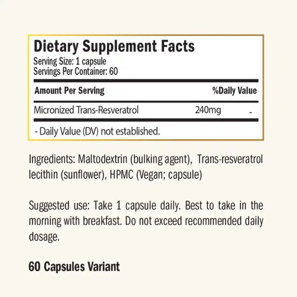 <table align='center' border='1' cellpadding='3' cellspacing='0'> <tbody> <tr valign='top'> <td colspan='3'><p><b>Voedingsinformatie: Voedingssupplement</b></p></td> </tr> <tr> <td colspan='3'>Portiegrootte: 1 capsule<br></td> </tr> <tr> <td colspan='3'>Porties per verpakking: 60<br></td> </tr> <tr valign='top'> <td width='70%'></td> <td width='15%'>Dagelijkse dosis per capsule</td> <td width='15%'>% RI</td> </tr> <tr> <td>Micronized Trans-Resveratrol</td> <td>240 mg</td> <td>†</td> </tr> <tr valign='top'> <td colspan='3'>† Referentie inname niet vastgesteld.</td> </tr> </tbody></table><h3>Ingrediënten</h3><p>Trans-resveratrol, maltodextrine (vulmiddel), lecithine (zonnebloem), HPMC (veganistisch; capsule).</p>