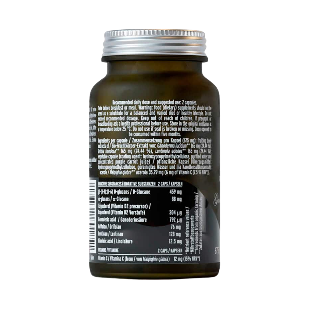 <table align='center' border='1' cellpadding='3' cellspacing='0'> <tbody> <tr valign='top'> <td colspan='3'><b>Voedingsinformatie: Voedingssupplement</b></td> </tr> <tr valign='top'> <td colspan='3'><strong>Portiegrootte:</strong> 2 capsules</td> </tr> <tr valign='top'> <td colspan='3'><strong>Verpakking Per Verpakking:</strong> 35</td> </tr> <tr valign='top'> <td width='70%'> </td> <td width='15%'>Hoeveelheid Per Portie</td> <td width='15%'>%RI*</td> </tr> <tr> <td>Polysachariden</td> <td>588 mg</td> <td></td> </tr> <tr> <td>β-(1-3), (1-6) D-glucanen</td> <td>229 mg</td> <td></td> </tr> <tr> <td>Alfa-glucanen</td> <td>88 mg</td> <td></td> </tr> <tr> <td>Triterpenoïde verbindingen</td> <td>18 mg</td> <td></td> </tr> <tr> <td>Ergosterol</td> <td>196 µg</td> <td></td> </tr> <tr> <td>Ganoderinezuur</td> <td>156 µg*</td> <td></td> </tr> <tr> <td>Grifolan</td> <td>5.60 g*</td> <td></td> </tr> <tr> <td>Lentinan</td> <td>8.24 g*</td> <td></td> </tr> <tr> <td>Vitamine B12</td> <td>0.56 μg</td> <td>22.40 %</td> </tr> </tbody></table><h3>Ingrediënten</h3><p>Ganoderma Lucidum-extract, Grifola Frondosa-extract, Lentinula Edodes-extract, Plantaardige capsule</p>