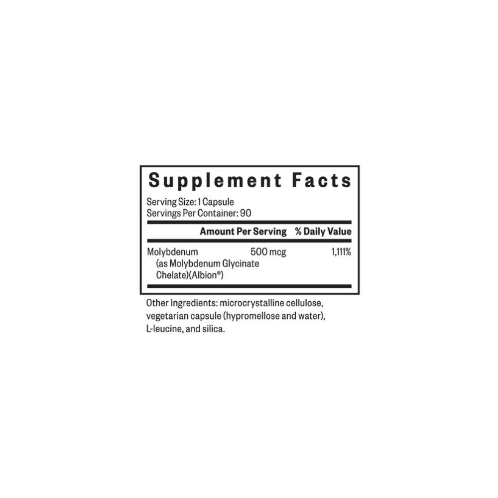 <table align='center' border='1' cellpadding='3' cellspacing='0'> <tbody> <tr valign='top'> <td colspan='3'><b>Voedingsinformatie: Voedingssupplement</b></td> </tr> <tr valign='top'> <td colspan='3'><strong>Portiegrootte:</strong> 1</td> </tr> <tr valign='top'> <td colspan='3'><strong>Aantal porties per verpakking:</strong> 90</td> </tr> <tr valign='top'> <td width='70%'></td> <td width='15%'>Hoeveelheid per portie</td> <td width='15%'>% RI</td> </tr> <tr> <td>Molybdeen (als Molybdeen Glycinaat Chelaat)(Albion®)</td> <td>500 mcg</td> <td>1111%</td> </tr> <tr valign='top'> <td colspan='3'>† Referentie Inname niet vastgesteld.</td> </tr> </tbody></table><h3>Ingrediënten</h3><p>Microkristallijne cellulose, vegetarische capsule (hypromellose en water), L-leucine, silica, Molybdeen (als Molybdeen Glycinaat Chelaat)(Albion®).</p>
