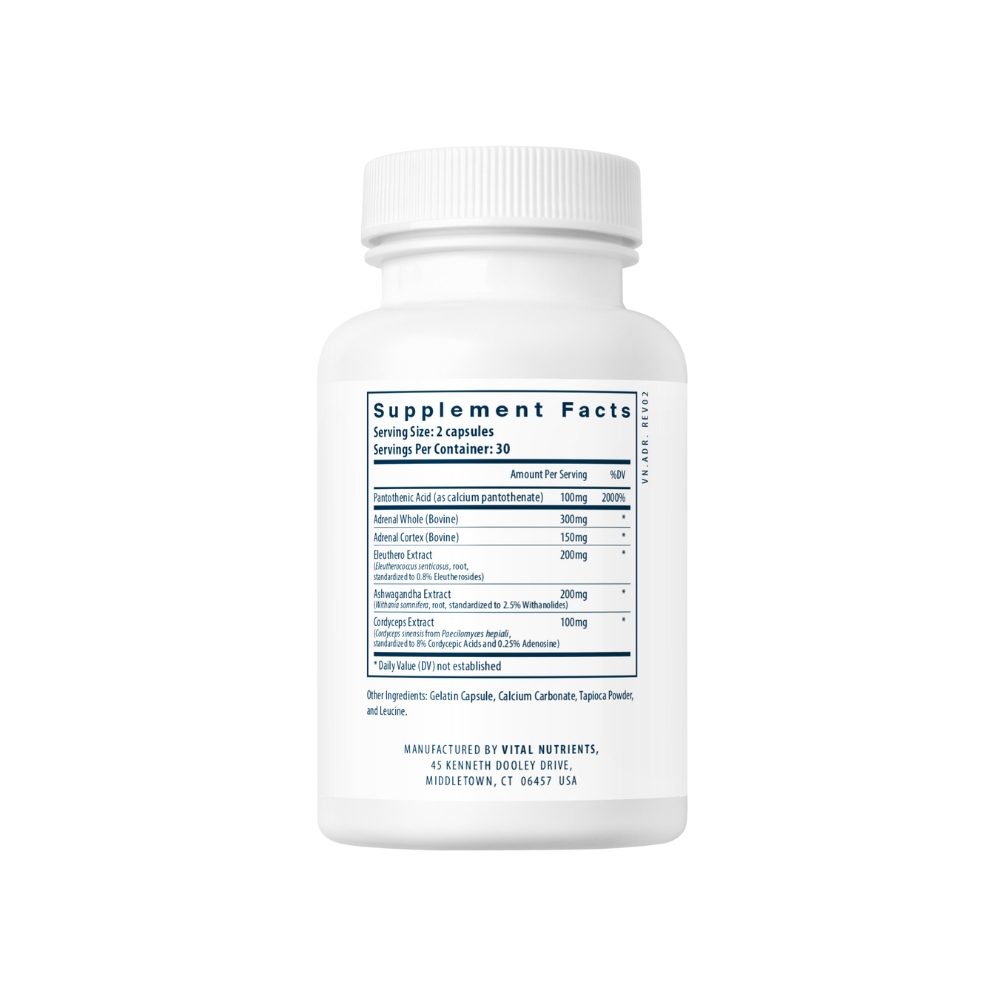 <div><li style='color: rgb(27, 12, 49); font-family: noto-sans, "Noto Sans", Helvetica, Arial, sans-serif;'>Combines Pantothenic Acid and Bovine Adrenal.</li><li style='color: rgb(27, 12, 49); font-family: noto-sans, "Noto Sans", Helvetica, Arial, sans-serif;'>Includes adaptogens like Eleuthero Root, Ashwagandha, and Cordyceps.</li><li style='color: rgb(27, 12, 49); font-family: noto-sans, "Noto Sans", Helvetica, Arial, sans-serif;'>Provides both whole and cortex adrenal components.</li></div>