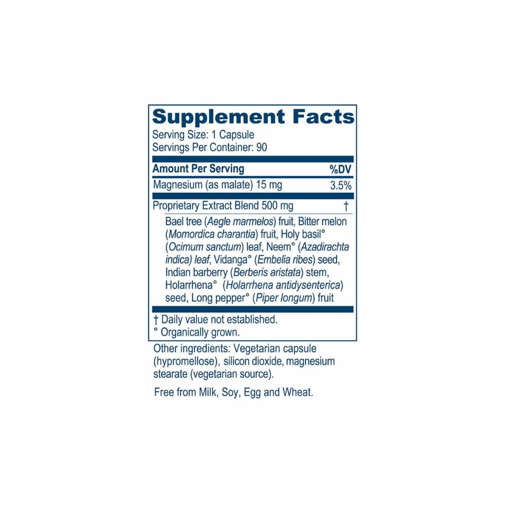 <table align="center" border="1" cellpadding="3" cellspacing="0"> <tbody> <tr valign="top"> <td colspan="3"><b>Nutritional Information: Food Supplement</b></td> </tr> <tr valign="top"> <td colspan="3"><strong>Serving Size: </strong>1</td> </tr> <tr valign="top"> <td colspan="3"><strong>Servings Per Container:</strong>&nbsp;90</td> </tr> <tr valign="top"> <td width="70%">&nbsp;</td> <td width="15%">Amount Per Serving</td> <td width="15%">Reference Intake%</td> </tr> <tr> <td>Magnesium Malate</td> <td>15 mg</td> <td>4%</td> </tr> <tr> <td>Proprietary Blend</td> <td>500 mg</td> <td>†</td> </tr> <tr> <td colspan="3">Aegle marmelos, Azadirachta indica, Berberis arisata, Embelia ribes, Holarrhena antidysenterica, Momordica charantia, Ocimum sanctum, and Piper Longum&nbsp; &nbsp; &nbsp;&nbsp;</td> </tr> <tr valign="top"> <td colspan="3">† Reference Intake not established.</td> </tr> </tbody></table><h3>Ingredients</h3><p>Magnesium, Aegle marmelos, Azadirachta indica, Berberis arisata, Embelia ribes, Holarrhena antidysenterica, Momordica charantia, Ocimum sanctum, Piper Longum, Vegetarian Capsule, Magnesium Stearate, Silicon Dioxide.</p>