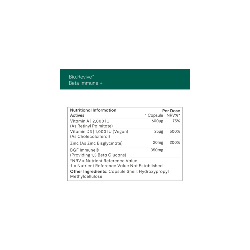 <p>Bio.Revive Beta Immune contains the essential vitamins and minerals required to support the immune system, alongside an immune-supportive fermented beta glucan complex.</p><p>• Can support the innate immune system</p><p>• Can support the production of immunoglobulins</p><p>• Can help rebalance gut health</p><p>• Contains polysaccharides to help boost the immune system</p><p>• Vitamin A, D and zinc all contribute to optimal functioning of immune cells</p><p>• Contains beta-glucans, to feed the beneficial bacteria in the gut</p><p>This formula contains the vitamins and minerals required to support the production of immunoglobulins, such as secretory immunoglobulin A (sIgA), and for the health of the innate immune response of the epithelial lining, which provides the first line of defence against invasion.</p><p>Suggested use is 1 capsule daily.</p>