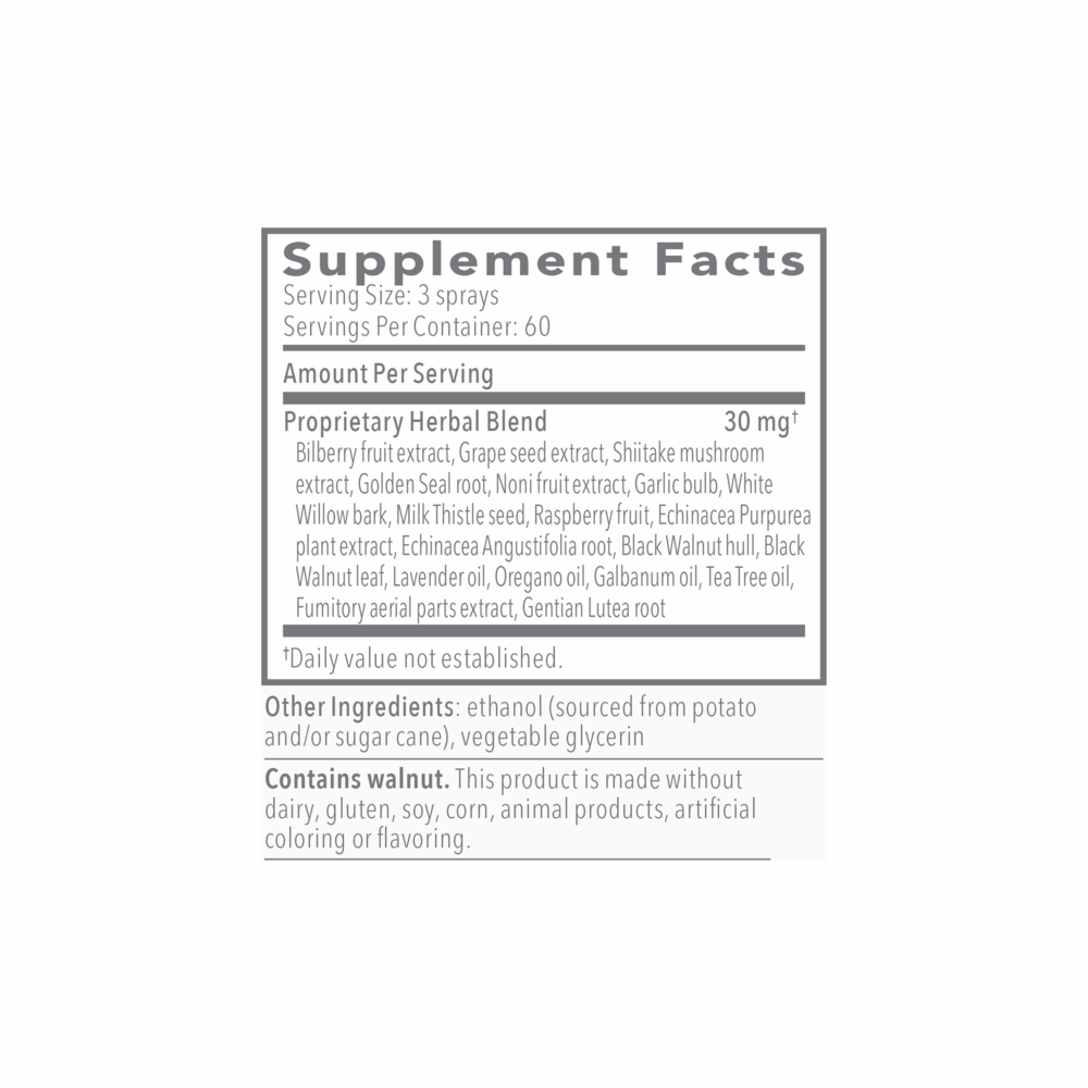 <table align="center" border="1" cellpadding="3" cellspacing="0"> <tbody> <tr valign="top"> <td colspan="3"><b>Nutritional Information: Food Supplement</b></td> </tr> <tr valign="top"> <td colspan="3"><strong>Serving Size: </strong>3</td> </tr> <tr valign="top"> <td colspan="3"><strong>Servings Per Container:</strong> 60</td> </tr> <tr valign="top"> <td width="70%"></td> <td width="15%">Amount Per Serving</td> <td width="15%">% Reference Intake</td> </tr> <tr> <td><strong>Proprietary Herbal Blend</strong></td> <td>30 mg</td> <td>†</td> </tr> <tr valign="top"> <td colspan="3">Bilberry extract, Noni extract, Milk Thistle, Echinacea Purpurea (extract) & Angustifolia, Goldenseal, Shiitake Extract, White Willow Bark, Garlic, Grape Seed Extract, Black Walnut (hull and leaf), Raspberry, Fumitory extract, Gentian, Tea Tree oil, Galbanum oil, Lavender oil, Oregano oil</td> </tr> <tr valign="top"> <td colspan="3">† Reference Intake not established.</td> </tr> </tbody></table><h3>Ingredients</h3><p>Bilberry extract, Noni extract, Milk Thistle, Echinacea Purpurea (extract) & Angustifolia, Goldenseal, Shiitake Extract, White Willow Bark, Garlic, Grape Seed Extract, Black <b>Walnut</b> (hull and leaf), Raspberry, Fumitory extract, Gentian, Tea Tree oil, Galbanum oil, Lavender oil, Oregano oil, 60% alcohol (potato and/or cane source), Vegetable glycerin.</p>