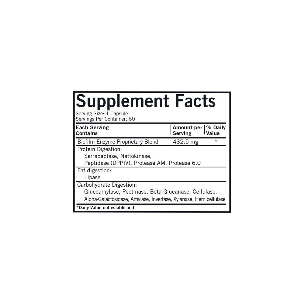 <table align="center" border="1" cellpadding="3" cellspacing="0"> <tbody> <tr valign="top"> <td colspan="3"><p><b>Nutritional Information: Food Supplement </b></p></td> </tr> <tr valign="top"> <td colspan="3"><strong>Serving Size:</strong> 1 Capsule</td> </tr> <tr valign="top"> <td colspan="3"><strong>Servings Per Container:</strong> 60</td> </tr> <tr valign="top"> <td width="70%"> </td> <td width="15%">Amount Per Serving</td> <td width="15%">% DV</td> </tr> <tr> <td>Biofilm Enzyme Proprietary Blend</td> <td>432.5 mg</td> <td>*</td> </tr> <tr> <td>Protein Digestion: Serrapeptase, Nattokinase, Peptidase (DPPIV), Protease AM, Protease 6.0</td> <td></td> <td></td> </tr> <tr> <td>Fat digestion: Lipase</td> <td></td> <td></td> </tr> <tr> <td>Carbohydrate Digestion: Glucoamylase, Pectinase, Beta-Glucanase, Cellulase, Alpha-Galactosidase, Amylase, Invertase, Xylanase, Hemicellulase</td> <td></td> <td></td> </tr> <tr valign="top"> <td colspan="3">* Daily Value not established.</td> </tr> </tbody></table><h3>Ingredients</h3><p>Biofilm Enzyme Proprietary Blend, Serrapeptase, Nattokinase, Peptidase (DPPIV), Protease AM, Protease 6.0, Lipase, Glucoamylase, Pectinase, Beta-Glucanase, Cellulase, Alpha-Galactosidase, Amylase, Invertase, Xylanase, Hemicellulase</p>