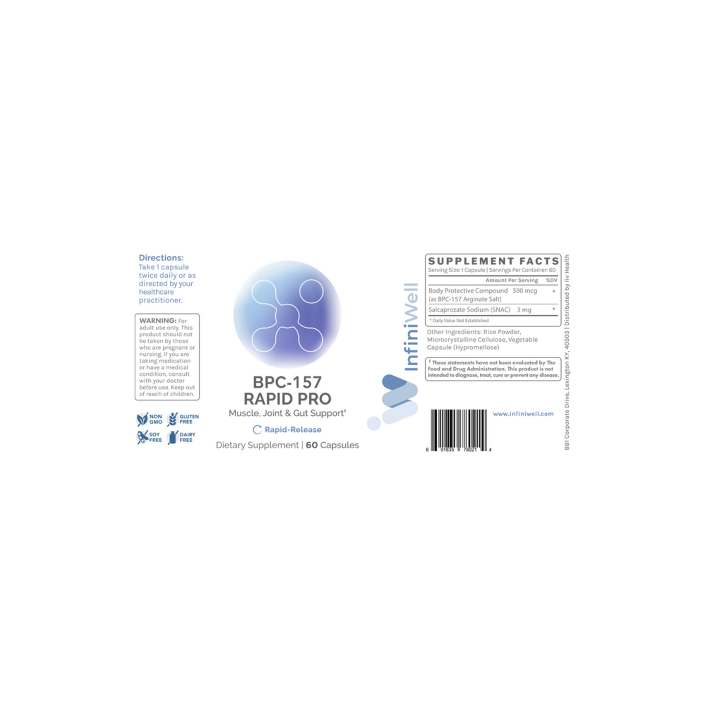 <p></p><p><strong data-start='906' data-end='935'><strong data-start='906' data-end='935'></strong></strong></p><h2 style='color: rgb(27, 12, 49); font-family: noto-sans, "Noto Sans", Helvetica, Arial, sans-serif;' class=''><span data-start='906' data-end='935' style=''><span data-start='906' data-end='935' style=''><span style='font-family: sans-serif; white-space-collapse: preserve-breaks;'>BPC-157 500 mcg Pro Rapid Release</span></span></span></h2><p style='color: rgb(27, 12, 49); font-family: noto-sans, "Noto Sans", Helvetica, Arial, sans-serif;'><span data-start='906' data-end='935' style=''><span data-start='906' data-end='935' style=''><span style='font-family: sans-serif; white-space-collapse: preserve-breaks;'>BPC-157 describes a partial sequence of amino acids naturally occurring in human gastric juices.</span></span></span></p><p style='color: rgb(27, 12, 49); font-family: noto-sans, "Noto Sans", Helvetica, Arial, sans-serif;'><span data-start='906' data-end='935' style=''><span data-start='906' data-end='935' style=''><span style='font-family: sans-serif; white-space-collapse: preserve-breaks;'>This 15-amino acid fragment is also frequently referred to as ‘Body Protection Compound’ (BPC).</span></span></span></p><strong data-start='906' data-end='935'><strong data-start='906' data-end='935'><span style='white-space-collapse: preserve-breaks; color: rgb(27, 12, 49); font-weight: 400; letter-spacing: 0px;'>This also include Salcaprozate Sodium (SNAC), which serves to elevate this formula’s efficacy and is unique to the InfiniWell suite of BPC products.</span></strong></strong><p></p><ul style='color: rgb(27, 12, 49); font-family: noto-sans, "Noto Sans", Helvetica, Arial, sans-serif;'><li><strong data-start='680' data-end='714' style='letter-spacing: 0px;'>Enhanced Absorption Technology</strong><span style='letter-spacing: 0px;'> – Includes </span><strong data-start='726' data-end='756' style='letter-spacing: 0px;'>Salcaprozate Sodium (SNAC)</strong><span style='letter-spacing: 0px;'>, a specialized absorption enhancer that boosts </span><strong data-start='804' data-end='836' style='letter-spacing: 0px;'>bioavailability and delivery</strong><span style='letter-spacing: 0px;'> of the active peptide.</span></li></ul><p><strong data-start='906' data-end='935'><strong data-start='906' data-end='935'></strong></strong></p><p></p><p><b style='letter-spacing: 0px;'>*Disclaimer: </b><span style='letter-spacing: 0px;'>Our supplements are trusted and selected by practitioners. Legislation limits the information we can share. For complete details, please refer to a medical library.</span></p>