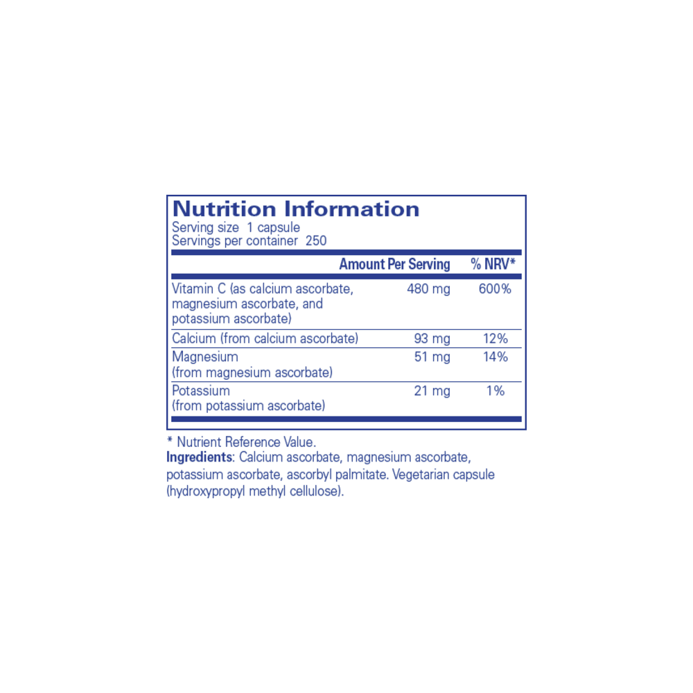 <table align="center" border="1" cellpadding="3" cellspacing="0"> <tbody> <tr align="left" valign="top"> <td colspan="3"><strong>Nutritional Information: Food Supplement </strong></td> </tr> <tr align="left" valign="top"> <td colspan="3"><strong>Serving Size: </strong>1 </td> </tr> <tr align="left" valign="top"> <td colspan="3"><strong>Servings Per Container:</strong> 250</td> </tr> <tr align="left" valign="top"> <td width="70%"> </td> <td width="15%"><span>Amount Per Serving:</span></td> <td width="15%"><span>% NRV*</span></td> </tr> <tr align="left" valign="top"> <td><span>Vitamin C (as calcium ascorbate, magnesium ascorbate and potassium ascorbate)</span></td> <td>480 mg</td> <td>600 %</td> </tr> <tr align="left" valign="top"> <td>Calcium (from calcium ascorbate)</td> <td>93 mg </td> <td>12%</td> </tr> <tr align="left" valign="top"> <td>Magnesium (from magnesium ascorbate)</td> <td>51 mg</td> <td>14%</td> </tr> <tr align="left" valign="top"> <td>Potassium (from potassium ascorbate)</td> <td>21 mg</td> <td>1%</td> </tr> <tr align="left" valign="top"> <td colspan="3">† Nutrient Reference Value</td> </tr> </tbody></table><h3>Ingredients</h3><p>Ascorbyl palmitate, vegetarian capsule (cellulose, water).</p>