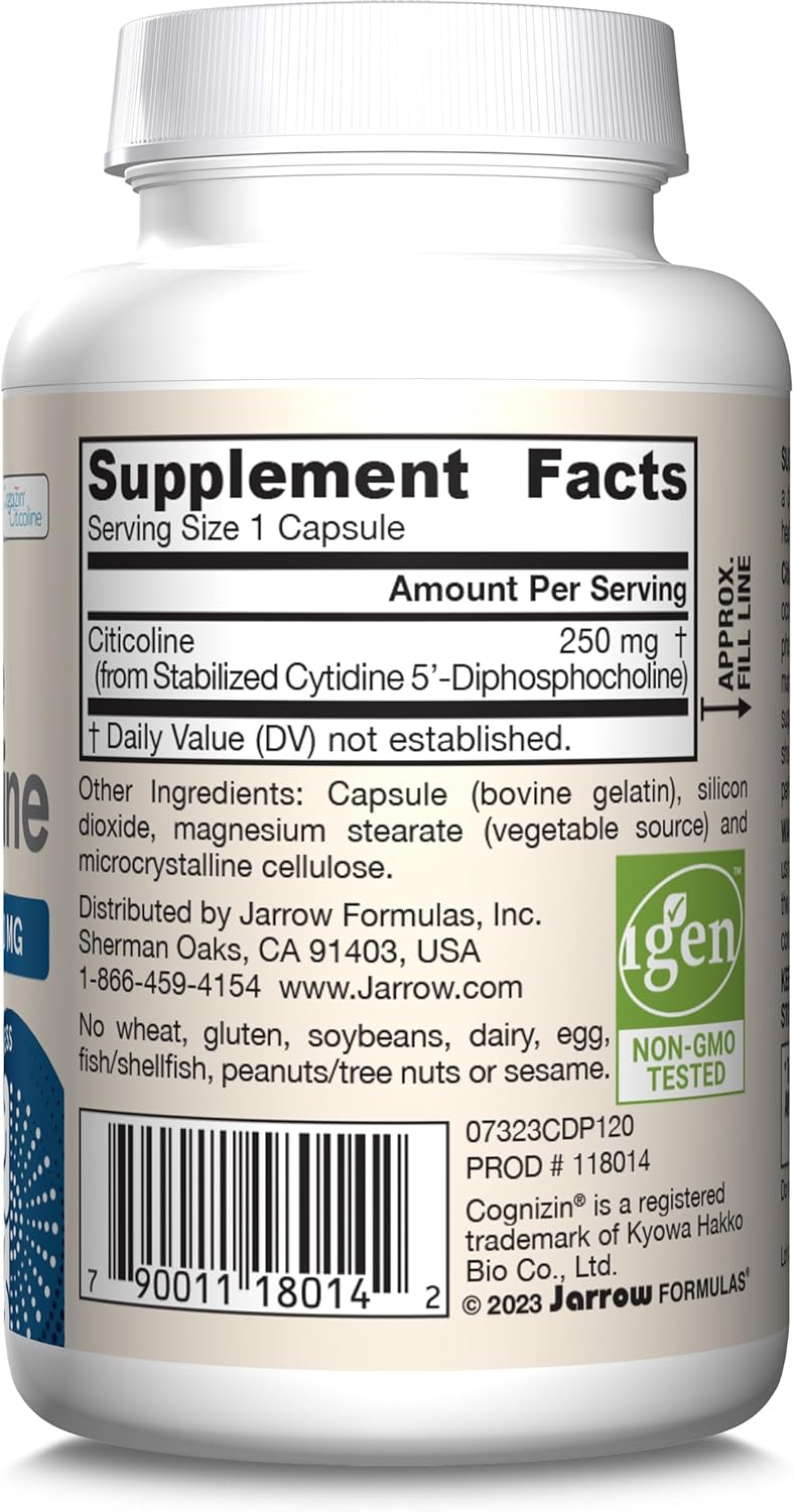 <table align="center" border="1" cellpadding="3" cellspacing="0" role="presentation" width="100%"> <tbody> <tr> <td colspan="3"><b>Nutritional Information: Food supplement</b></td> </tr> <tr> <td colspan="3"><strong>Serving Size:</strong> 1</td> </tr> <tr> <td colspan="3"><strong>Serving per Container:</strong> 60</td> </tr> <tr> <td width="70%"> </td> <td width="15%"><strong>Amount Per Serving</strong></td> <td width="15%"><strong>% Reference Intake</strong></td> </tr> <tr> <td>Citicoline (Cognizin) (from stabilized cytidine 5'diphosphocholine)</td> <td>250 mg</td> <td>†</td> </tr> <tr> <td colspan="3">† Reference Intake not established.</td> </tr> </tbody></table><h3>Ingredients</h3><p>Silicon Dioxide, Magnesium Stearate (vegetable source), Cellulose, Gelatin, Citicoline (Cognizin)</p>