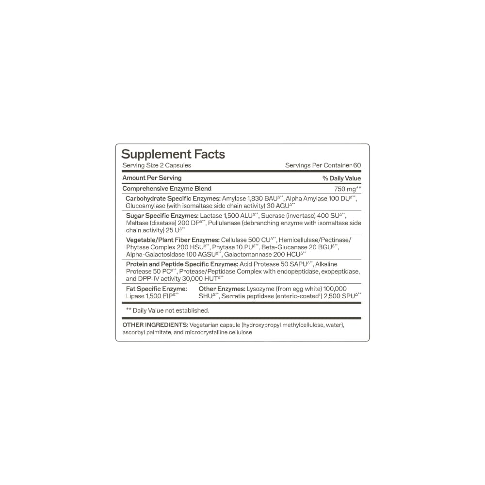 <table align="center" border="1" cellpadding="3" cellspacing="0" height="176" width="888"> <tbody> <tr valign="top"> <td colspan="3"><b>Nutritional Information</b></td> </tr> <tr valign="top"> <td colspan="3"><strong>Serving Size: </strong>2 capsules</td> </tr> <tr valign="top"> <td colspan="3"><strong>Servings Per Container:</strong>&nbsp;60</td> </tr> <tr valign="top"> <td width="70%">&nbsp;</td> <td width="15%">Amount Per Serving</td> <td width="15%">%Daily Value*</td> </tr> <tr> <td> <p><strong>Comprehensive Enzyme Blend</strong></p> <p>Carbohydrate Specific Enzymes: Amylase 1,830 BAU, Alpha Amylase 100 DU, Glucoamylase (with isomaltase side chain activity) 30 AGU</p> <p>Sugar Specific Enzymes: Lactase 1,500 ALU Sucarase (invertase) 400 SU, Maltase (diastase) 200 DP, Pullulanase (debranching enzymes with isomaltase side chain activity) 25 U</p> <p>Vegetable/Plant Fiber Specfic Enzymes: Cellulase 500 CU, Hemicellulase/Pectinase/Phytase Complex 200 HSU, Phytase 10 PU, Beta-Glucanase 20 BGU, Alpha-Galactosidase 100 AGSU, Galactomannase 200 HCU</p> <p>Protein and Peptide Specific Enzymes: Acid Protease 50 SAPU, Alkaline Protease 50 PC, Protease/Peptidase Complex, with endopeptidase, exopeptidase, and DPP-IV activity 40,000 HUT</p> <p>Fat Specific Enzyme: Lipase 1,500 FIPU</p> <p>Other Enzymes: Lysozyme (from egg white) 100,000 SHU, Serratia peptidase (enteric-coated) 2,500 SPU</p> </td> <td>~825mg</td> <td>†</td> </tr> <tr valign="top"> <td colspan="3">† Daily Value not established.</td> </tr> </tbody></table><h3><strong>Other Ingredients</strong></h3><p>Vegetarian capsule (hydroxypropyl methylcellulose, water), ascorbyl palmitate, and microcrystalline cellulose.</p><p>&nbsp;</p>