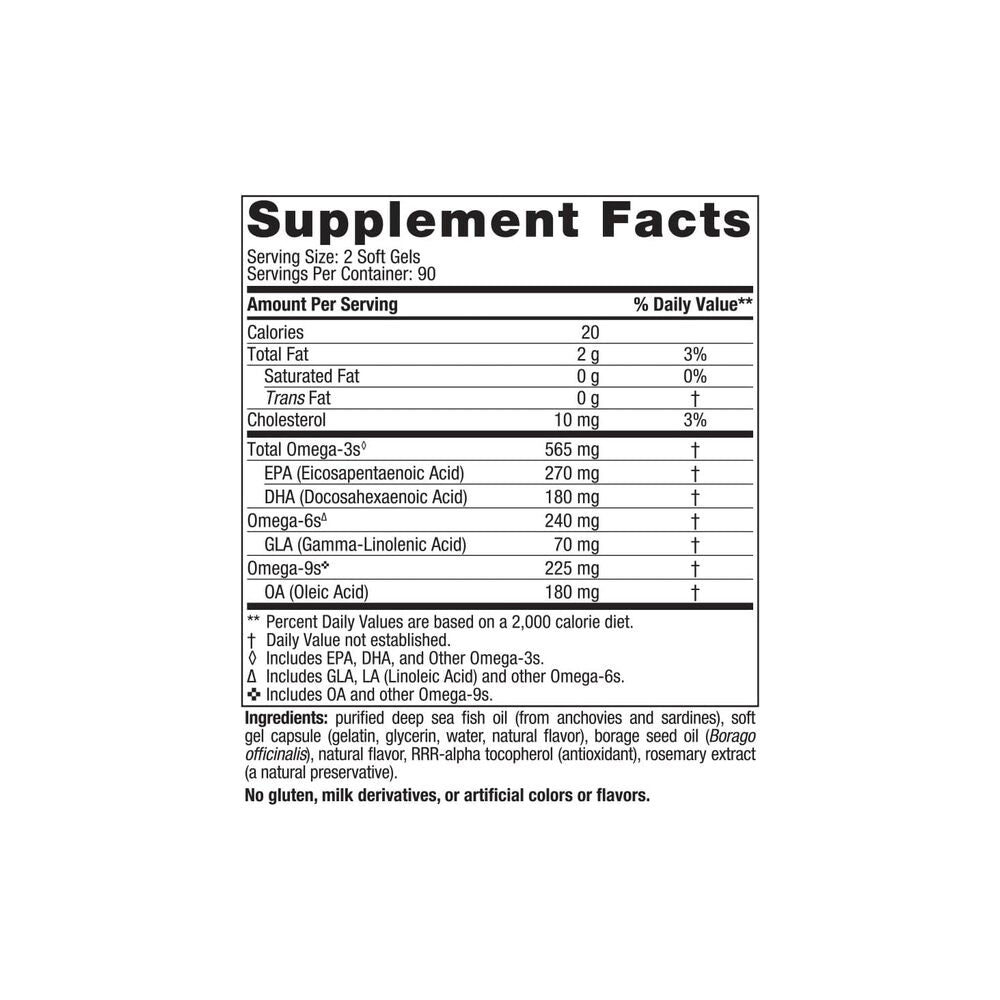 <ul><li>565 mg total omega-3s (soft gels); 1270 mg total omega-3s (liquid)</li></ul><ul> <li>The perfect balanced combination of omegas 3, 6, and 9</li></ul><ul> <li>With added GLA from borage oil</li></ul><ul> <li>Supports heart, brain, joint, and skin health*</li></ul><ul> <li>Combines pure, fresh omega-3 fish oil with sustainably sourced borage oi</li></ul>