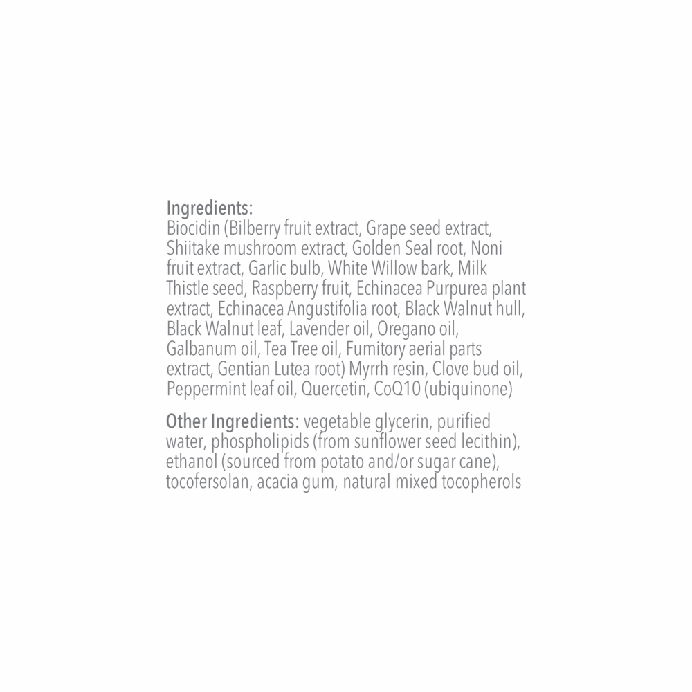 <table align="center" border="1" cellpadding="3" cellspacing="0"> <tbody> <tr valign="top"> <td colspan="3"><b>Nutritional Information: Food Supplement</b></td> </tr> <tr valign="top"> <td colspan="3"><strong>Serving Size:</strong> 2</td> </tr> <tr valign="top"> <td colspan="3"><strong>Servings Per Container:</strong> 75</td> </tr> <tr valign="top"> <td width="70%"></td> <td width="15%">Amount Per Serving</td> <td width="15%">% Reference Intake*</td> </tr> <tr> <td><strong>Biocidin Proprietary Blend:</strong></td> <td>32 mg</td> <td>118%</td> </tr> <tr> <td colspan="3">Biocidin® (Bilberry extract, Noni extract, Milk Thistle, Echinacea Purpurea (extract) & Angustifolia, Goldenseal, Shiitake extract, White Willow Bark, Garlic, Grape Seed extract, Black Walnut (hull and leaf), Raspberry, Fumitory extract, Gentian, Tea Tree oil, Galbanum oil, Lavender oil, Oregano oil), Quercetin, CoQ10 (ubiquinone), Myrrh resin, Clove bud oil, Peppermint leaf.</td> </tr> <tr valign="top"> <td colspan="3">† Reference Intake not established.</td> </tr> </tbody></table><h3>Ingredients</h3><p>Biocidin® (Bilberry extract, Noni extract, Milk Thistle, Echinacea Purpurea (extract) & Angustifolia, Goldenseal, Shiitake extract, White Willow Bark, Garlic, Grape Seed extract, Black <b>Walnut</b> (hull and leaf), Raspberry, Fumitory extract, Gentian, Tea Tree oil, Galbanum oil, Lavender oil, Oregano oil), Quercetin, CoQ10 (ubiquinone), Myrrh resin, Clove bud oil, Peppermint leaf, Vegetable glycerin, Phospholipids (from purified Sunflower Seed lecithin), purified water, ethanol, Vitamin E (as Tocofersolan and natural mixed tocopherols).</p>