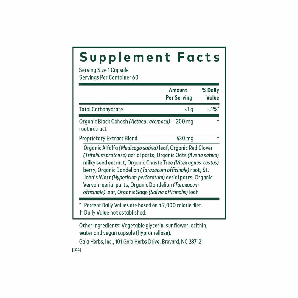 <table align="center" border="1" cellpadding="3" cellspacing="0"> <tbody> <tr align="left" valign="top"> <td colspan="3"><strong>Nutritional Information: Food supplement </strong></td> </tr> <tr align="left" valign="top"> <td colspan="3"><strong>Serving Size:</strong> 1 Capsule</td> </tr> <tr align="left" valign="top"> <td colspan="3"><strong>Servings Per Container:</strong> 60</td> </tr> <tr align="left" valign="top"> <td width="70%"> </td> <td width="15%">Amount Per Serving</td> <td width="15%">%Daily Value</td> </tr> <tr align="left" valign="top"> <td>Total Carbohydrate</td> <td><1 g</td> <td><1%</td> </tr> <tr> <td>Organic Black Cohosh</td> <td>200 mg</td> <td>*</td> </tr> <tr> <td> <p>Proprietary Extract Blend</p> <p>Organic Alfalfa (Medicago sativa) leaf, Organic Red Clover (Trifolium pratense) aerial parts, Organic Oats (Avena sativa) milky seed extract, Organic Chaste Tree (Vitex agnus-castus) berry, Organic Dandelion (Taraxacum officinale) root, St. John's Wort (Hypericum perforatum) aerial parts, Organic Vervain aerial parts, Organic Dandelion (Taraxacum officinale) leaf, Organic Sage (Salvia officinalis) leaf.</p> </td> <td>430 mg</td> <td>*</td> </tr> <tr align="left" valign="top"> <td colspan="3">* Daily Value not established.</td> </tr> </tbody></table><p><strong>Ingredients:</strong> Vegetable glycerin, sunflower lecithin, water and vegan capsule (hypromellose).</p>