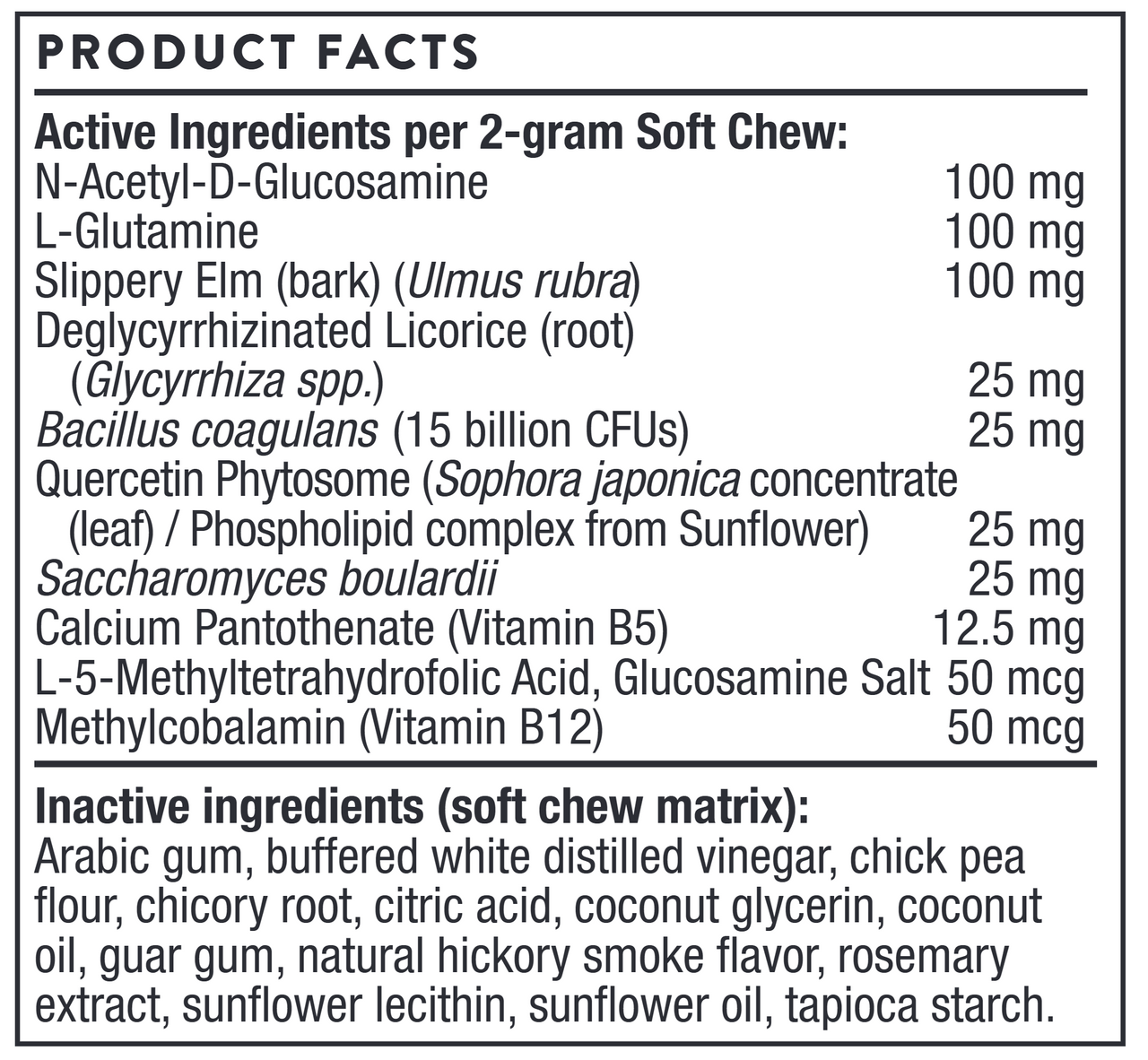 <table align="center" border="1" cellpadding="3" cellspacing="0"> <tbody> <tr valign="top"> <td colspan="3"><b>Nutritional Information: Food Supplement, Active Ingredients per 2-gram Soft Chew</b></td> </tr> <tr valign="top"> <td colspan="3"><strong>Serving Size:</strong> 2 grams (1 soft chew)</td> </tr> <tr valign="top"> <td colspan="3"><strong>Servings Per Container:</strong> 1</td> </tr> <tr valign="top"> <td width="70%"></td> <td width="15%">Amount Per Serving</td> <td width="15%">%RI*</td> </tr> <tr> <td>N-Acetyl-D-Glucosamine</td> <td>100 mg</td> <td>†</td> </tr> <tr> <td>L-Glutamine</td> <td>100 mg</td> <td>†</td> </tr> <tr> <td>Slippery Elm (bark) (Ulmus rubra)</td> <td>100 mg</td> <td>†</td> </tr> <tr> <td>Deglycyrrhizinated Licorice (root) (Glycyrrhiza spp.)</td> <td>25 mg</td> <td>†</td> </tr> <tr> <td>Bacillus coagulans (15 billion CFUs)</td> <td>25 mg</td> <td>†</td> </tr> <tr> <td>Quercetin Phytosome (Sophora japonica concentrate (leaf) / Phospholipid complex from Sunflower)</td> <td>25 mg</td> <td>†</td> </tr> <tr> <td>Saccharomyces boulardii</td> <td>25 mg</td> <td>†</td> </tr> <tr> <td>Calcium Pantothenate (Vitamin B5)</td> <td>12.5 mg</td> <td>208%</td> </tr> <tr> <td>L-5-Methyltetrahydrofolic Acid, Glucosamine Salt</td> <td>50 mcg</td> <td>25%</td> </tr> <tr> <td>Methylcobalamin (Vitamin B12)</td> <td>50 mcg</td> <td>2,000%</td> </tr> <tr valign="top"> <td colspan="3">† Reference Intake not established.</td> </tr> </tbody></table><div class="other-info"> <p><strong>Inactive ingredients (soft chew matrix):</strong> Arabic gum, buffered white distilled vinegar, chick pea flour, chicory root, citric acid, coconut glycerin, coconut oil, guar gum, natural hickory smoke flavor, rosemary extract, sunflower lecithin, sunflower oil, tapioca starch.</p></div><h3>Ingredients</h3><p>N-Acetyl-D-Glucosamine, L-Glutamine, Slippery Elm (bark) (Ulmus rubra), Deglycyrrhizinated Licorice (root) (Glycyrrhiza spp.), Bacillus coagulans, Quercetin Phytosome (Sophora japonica concentrate (leaf) / Phospholipid complex from Sunflower), Saccharomyces boulardii, Calcium Pantothenate (Vitamin B5), L-5-Methyltetrahydrofolic Acid, Glucosamine Salt, Methylcobalamin (Vitamin B12), Arabic gum, buffered white distilled vinegar, chick pea flour, chicory root, citric acid, coconut glycerin, coconut oil, guar gum, natural hickory smoke flavor, rosemary extract, sunflower lecithin, sunflower oil, tapioca star</p>