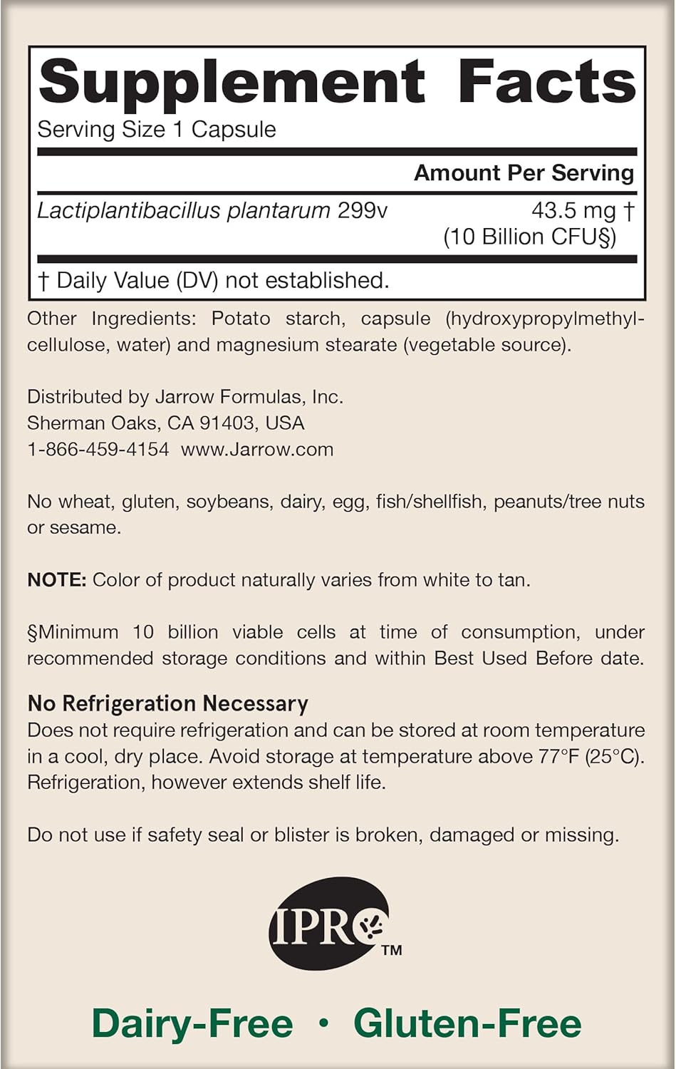 <table align="center" border="1" cellpadding="3" cellspacing="0"> <tbody> <tr valign="top"> <td colspan="3"><b>Nutritional Information: Food supplement</b></td> </tr> <tr valign="top"> <td colspan="3"><strong>Serving Size: </strong>1</td> </tr> <tr valign="top"> <td colspan="3"><strong>Servings Per Container:</strong> 30</td> </tr> <tr valign="top"> <td width="70%"> </td> <td width="15%">Amount Per Serving</td> <td width="15%">% Reference Intake</td> </tr> <tr> <td>Lactobacillus plantarum 299v </td> <td>10 Billion Viable Cells (minimum) CFU<br></td> <td>†</td> </tr> <tr valign="top"> <td colspan="3">† Reference Intake not established.</td> </tr> </tbody></table><h3>Ingredients</h3><p>Potato Starch, Magnesium Stearate (vegetable source), Hydroxypropylmethylcellulose, Lactobacillus plantarum 299v</p>