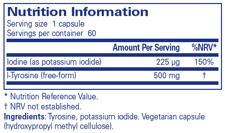 <p style="color: rgb(27, 12, 49); font-family: noto-sans, "Noto Sans", Helvetica, Arial, sans-serif;">Iodine and Tyrosine by Pure Encapsulations provides a more reliable form of iodine than kelp, in potassium iodide form.</p><p style="color: rgb(27, 12, 49); font-family: noto-sans, "Noto Sans", Helvetica, Arial, sans-serif;"><span style="letter-spacing: 0px;">- Iodine contributes to</span> the production of thyroid hormones and normal thyroid function</p><p style="color: rgb(27, 12, 49); font-family: noto-sans, "Noto Sans", Helvetica, Arial, sans-serif;">- Iodine contributes to normal energy-yielding metabolism</p><p style="color: rgb(27, 12, 49); font-family: noto-sans, "Noto Sans", Helvetica, Arial, sans-serif;">- Iodine supports normal cognitive function</p><p style="color: rgb(27, 12, 49); font-family: noto-sans, "Noto Sans", Helvetica, Arial, sans-serif;">- Iodine contributes to the normal function of the nervous system</p><p style="color: rgb(27, 12, 49); font-family: noto-sans, "Noto Sans", Helvetica, Arial, sans-serif;">- Iodine contributes to the maintenance of normal skin</p><p style="color: rgb(27, 12, 49); font-family: noto-sans, "Noto Sans", Helvetica, Arial, sans-serif;">- Ensures optimal iodine intake.</p><p style="color: rgb(27, 12, 49); font-family: noto-sans, "Noto Sans", Helvetica, Arial, sans-serif;"><br></p><p style=""><font color="#1b0c31" face="noto-sans, Noto Sans, Helvetica, Arial, sans-serif">More information about this product</font></p><p style=""><font color="#1b0c31" face="noto-sans, Noto Sans, Helvetica, Arial, sans-serif"><br></font></p><p style=""><font color="#1b0c31" face="noto-sans, Noto Sans, Helvetica, Arial, sans-serif">Unfortunately, due to legislation concerning supplements, we are not allowed to provide (complete) information about this product. For more information we refer you to a library of medicine</font></p>