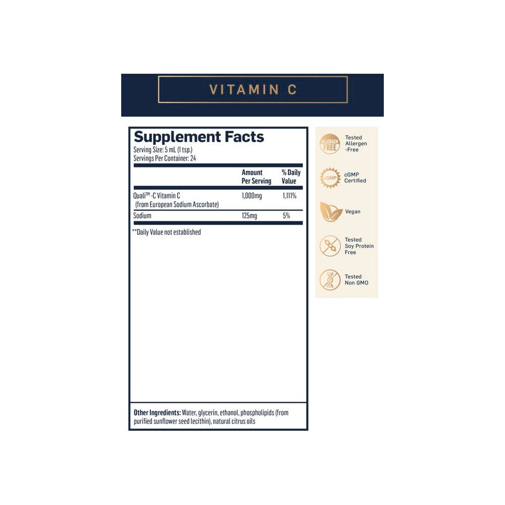 <table align="center" border="1" cellpadding="3" cellspacing="0" style="width: 100%;"> <tbody> <tr> <td colspan="3"><b>Nutritional Information: Food supplement, Vitamines</b></td> </tr> <tr> <td colspan="3"><strong>Serving Size:</strong> 5ml</td> </tr> <tr> <td colspan="3"><strong>Servings Per Container</strong>: 24</td> </tr> <tr> <td width="70%">&nbsp;</td> <td width="15%">Amount Per Serving</td> <td width="15%">% Reference Intake</td> </tr> <tr> <td>Quali-C Vitamin C (from European Sodium Ascorbate)</td> <td>1,000 mg</td> <td>1,250</td> </tr> <tr> <td>Sodium</td> <td>125 mg</td><td>6</td> </tr> <tr> <td colspan="3">† Reference Intake not established.</td> </tr> </tbody></table><h3>Ingredients</h3><div>Quali-C Vitamin C (from European Sodium Ascorbate), Sodium,&nbsp;<span style="letter-spacing: 0px;">Water, Glycerin, Ethanol, Natural Citrus Oils.</span></div>