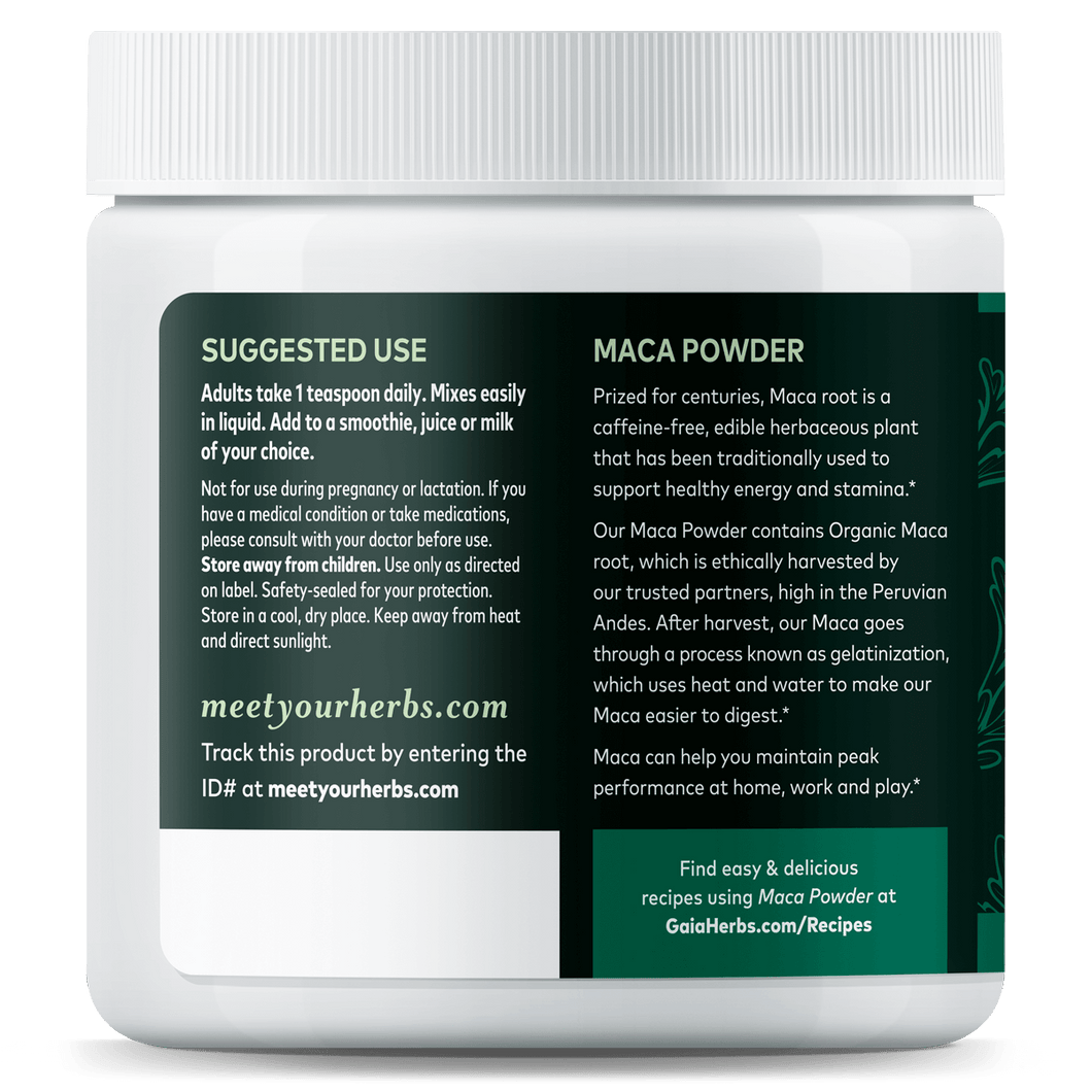 <ul><li>A caffeine-free, edible herbaceous plant</li><li>Gaia Herbs Maca Powder is ideal for athletes</li></ul>