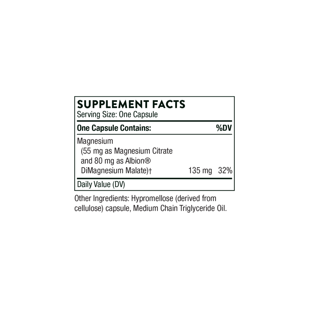 <table align="center" border="1" cellpadding="3" cellspacing="0"> <tbody> <tr valign="top"> <td colspan="3"><b>Nutritional Information: Food supplement</b></td> </tr> <tr valign="top"> <td colspan="3"><strong>Serving Size: </strong>1 capsule</td> </tr> <tr valign="top"> <td colspan="3"><strong>Servings Per Container:</strong> 90</td> </tr> <tr valign="top"> <td width="70%"> </td> <td width="15%">Amount Per Serving</td> <td width="15%">% Reference Intake</td> </tr> <tr> <td>Magnesium (Dimagnesium Malate)</td> <td>80 mg</td> <td>21.3%</td> </tr> <tr> <td>Magnesium (Citrate)</td> <td>55 mg</td> <td>14.7%</td> </tr> <tr valign="top"> <td colspan="3">† Reference Intake not established.</td> </tr> </tbody></table><h3>Ingredients</h3><p>Magnesium (Dimagnesium Malate), Magnesium (Citrate), Hypromellose Capsule, Medium Chain Triglycerides</p>