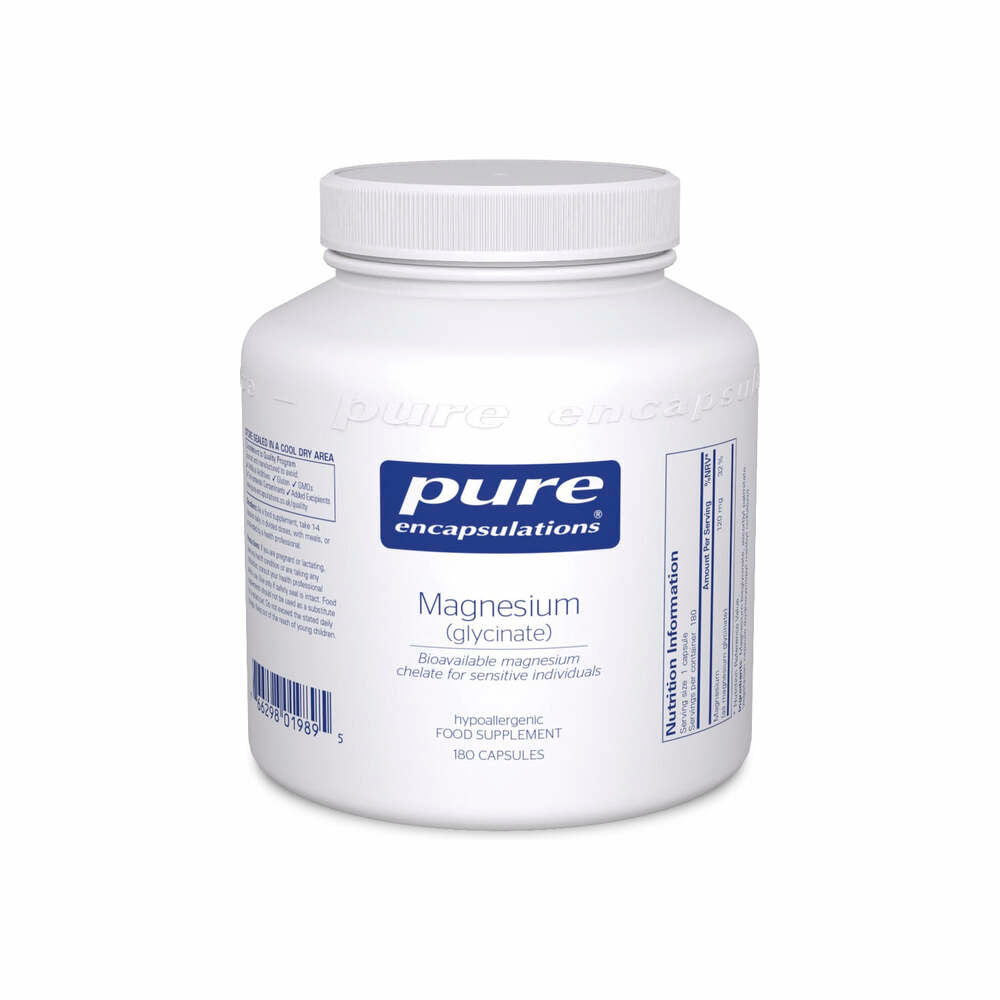 <p>Magnesium Glycinate by Pure Encapsulations is a well tolerated form of magnesium, therefore suitable for those with sensitive digestive systems. It is in a chelated form, which makes it more absorbable. Magnesium is needed for over 300 enzymatic reactions in the body.</p><p>- Supports the maintenance of healthy bones and teeth</p><p>- Can support muscle health and may prevent or reduce cramps</p><p>- Supports the normal functioning of the nervous system</p><p>- May boost energy levels</p><p>- May help to reduce tiredness and fatigue</p><p>- May support mood and emotional health</p><p>Magnesium Glycinate is well tolerated and highly bioavailable and absorbable for those who struggle to take other forms of magnesium. Magnesium levels are often depleted in foods, as a result of poor soil quality. Yet, it is one of the most important minerals and needed for so many reactions to occur in the body. Without a plentiful supply of magnesium, the electrolyte balance is out of balance and this can lead to things like muscle cramps. Magnesium works alongside calcium and phosphorus to support bone and dental health. It is also needed for the process of making energy and therefore when we have sufficient magnesium, our energy levels are often higher.</p><p>Suggested use is 1-4 capsules daily.</p>