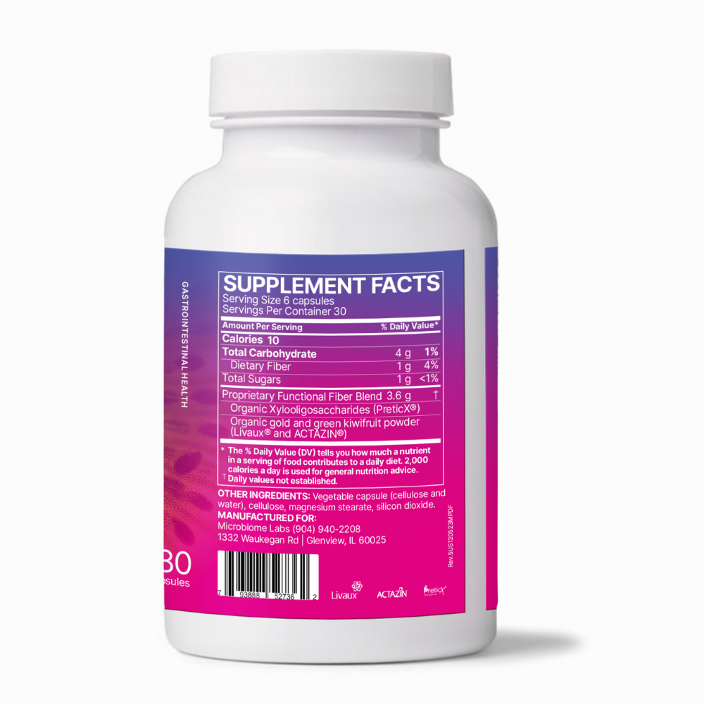 <table align="center" border="1" cellpadding="3" cellspacing="0"> <tbody> <tr valign="top"> <td colspan="3"><b>Nutritional Information: Food Supplement</b></td> </tr> <tr> <td colspan="3"><b>Serving Size: 6 Capsules</b></td> </tr> <tr> <td colspan="3"><b>Servings Per Container: 30</b></td> </tr> <tr valign="top"> <td width="70%"></td> <td width="15%">Amount per serving</td> <td width="15%">% RI</td> </tr> <tr> <td>Calories</td> <td>10</td> <td>†</td> </tr> <tr> <td>Total Carbohydrate</td> <td>4 g</td> <td>1%</td> </tr> <tr> <td style="padding-left: 20px;">Dietary Fiber</td> <td>1 g</td> <td>4%</td> </tr> <tr> <td style="padding-left: 20px;">Total Sugars</td> <td>1 g</td> <td><1%</td> </tr> <tr> <td>Proprietary Functional Fiber Blend</td> <td>3.6 g</td> <td>†</td> </tr> <tr> <td style="padding-left: 20px;">Organic Xylooligosaccharides (PreticX<sup>®</sup>)</td> <td></td> <td>†</td> </tr> <tr> <td style="padding-left: 20px;">Organic gold and green kiwifruit powder (Livaux<sup>®</sup> and ACTAZIN<sup>®</sup>)</td> <td></td> <td>†</td> </tr> <tr valign="top"> <td colspan="3">† Reference Intake not established.</td> </tr> </tbody></table><h3>Ingredients</h3><p><span style="letter-spacing: 0px;">Proprietary Functional Fiber Blend</span>, vegetable capsule (cellulose and water), cellulose, magnesium stearate, silicon dioxide.</p>