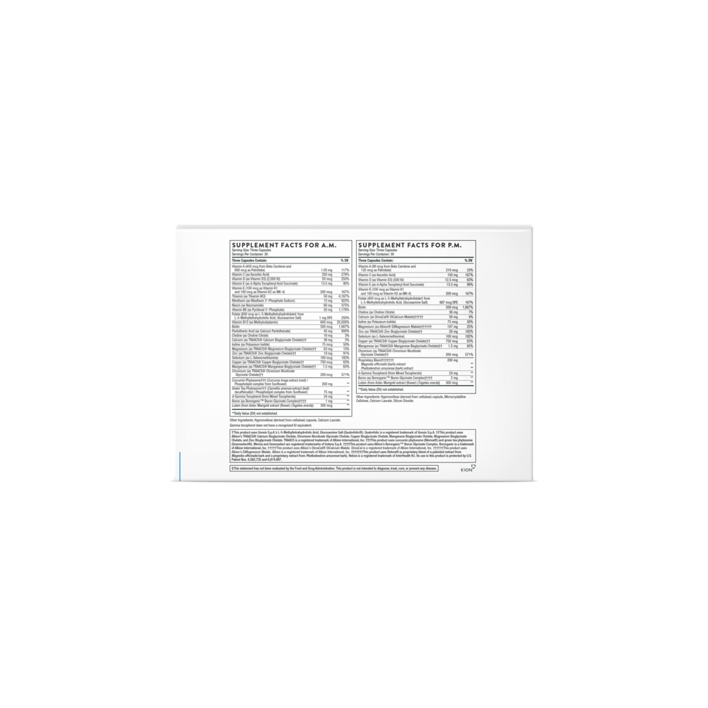 <p><strong>Supplement Facts For A.M.</strong></p><table align="center" border="1" cellpadding="3" cellspacing="0"> <tbody> <tr align="left" valign="top"> <td colspan="3"><strong>Nutritional Information: Food supplement</strong></td> </tr> <tr align="left" valign="top"> <td colspan="3"><strong>Serving Size:</strong>&nbsp;3 Capsules</td> </tr> <tr align="left" valign="top"> <td colspan="3"><strong>Servings Per Container:</strong>&nbsp;30</td> </tr> <tr align="left" valign="top"> <td width="70%">&nbsp;</td> <td width="15%">Amount Per Serving</td> <td width="15%">%Reference Intake</td> </tr> <tr> <td>Vitamin C (as Ascorbic Acid)</td> <td>250 mg</td> <td>312.5%</td> </tr> <tr> <td>Curcumin Phytosome (<em>Curcuma longa</em> extract (root) / Phospholipid complex from Sunflower)</td> <td>200 mg</td> <td>†</td> </tr> <tr> <td>Green Tea Phytosome (<em>Camellia sinensis</em> extract [leaf] decaffeinated / Phospholipid complex from Sunflower)</td> <td>75 mg</td> <td>†</td> </tr> <tr> <td>Magnesium (as TRAACS Magnesium Bisglycinate Chelate)</td> <td>63 mg</td> <td>16.8%</td> </tr> <tr> <td>Calcium (as TRAACS Calcium Bisglycinate Chelate)</td> <td>63 mg</td> <td>7.9%</td> </tr> <tr> <td>Niacin (as Niacinamide)</td> <td>60 mg</td> <td>375%</td> </tr> <tr> <td>Thiamin (as Thiamin HCl)</td> <td>50 mg</td> <td>4545.5%</td> </tr> <tr> <td>Pantothenic Acid (as Calcium Pantothenate)</td> <td>45 mg</td> <td>750%</td> </tr> <tr> <td>d-Gamma Tocopherol (from Mixed Tocopherols)</td> <td>24 mg</td> <td>†</td> </tr> <tr> <td>Vitamin B6 (as Pyridoxal 5'-Phosphate)</td> <td>20 mg</td> <td>1428.6%</td> </tr> <tr> <td>Vitamin E (as d-Alpha Tocopheryl Acid Succinate)</td> <td>13.5 mg</td> <td>112.5%</td> </tr> <tr> <td>Riboflavin (as Riboflavin 5'-Phosphate Sodium)</td> <td>12 mg</td> <td>857.1%</td> </tr><tr> <td>Zinc (as TRAACS Zinc Bisglycinate Chelate)</td> <td>10 mg</td> <td>100%</td> </tr><tr> <td>Manganese (as TRAACS Manganese Bisglycinate Chelate)</td> <td>1.5 mg</td> <td>75%</td> </tr> <tr> <td>Vitamin A (450mcg from Beta Carotene and 600mcg as Palmitate)</td> <td>1.05 mg</td> <td>131.25%</td> </tr> <tr> <td>Folate (600mcg as L-5-Methyltetrahydrofolate from L-5-Methyltetrahydrofolic Acid, Glucasamine Salt)</td> <td>1 mgDFE</td> <td>500%</td> </tr> <tr> <td>Boron (as Bororganic Boron Glycinate Complex)</td> <td>1 mg</td> <td>6.7%</td> </tr><tr> <td>Copper (as TRAACS Copper Bisglycinate Chelate)</td> <td>750 mcg</td> <td>75%</td> </tr> <tr> <td>Vitamin B12 (as Methylcobalamin)</td> <td>600 mcg</td> <td>24000%</td> </tr> <tr> <td>Biotin&nbsp;</td> <td>500 mcg</td> <td>1000%</td> </tr> <tr> <td>Lutein (from Aztec Marigold extract (flower) (<em>Tagetes erecta</em>))</td> <td>300 mcg</td> <td>†</td> </tr> <tr> <td>Vitamin K (100mcg as Vitamin K1 and 100 mcg as Vitamin K2 as MK-4)</td> <td>200 mcg</td> <td>266.7%</td> </tr> <tr> <td>Chromium (as TRAACS Chromium Nicotinate Glycinate Chelate)</td> <td>200 mcg</td> <td>500%</td> </tr> <tr> <td>Selenium (as L-Selenomethionine)</td> <td>100 mcg</td> <td>181.8%</td> </tr> <tr> <td>Iodine (as Potassium Iodide)</td> <td>75 mcg</td> <td>50%</td> </tr> <tr> <td>Vitamin D (as Vitamin D3) (2000 IU)</td> <td>50 mcg</td> <td>1000%</td> </tr> <tr align="left" valign="top"> <td colspan="3">† Reference Intake not established.</td> </tr> </tbody></table><h3>Ingredients:</h3><p>Vitamins, Minerals, Lutein,&nbsp;<span style="letter-spacing: 0px;">Curcumin Phytosome,&nbsp;</span><span style="letter-spacing: 0px;">Green Tea Phytosome,&nbsp;</span><span style="letter-spacing: 0px;">d-Gamma Tocopherol,</span><span style="letter-spacing: 0px;">&nbsp;Hypromellose (derived from cellulose) capsule, Calcium Laurate.</span></p><p>&nbsp;</p><p><strong>Supplement Facts For P.M.</strong></p><table align="center" border="1" cellpadding="3" cellspacing="0"> <tbody> <tr align="left" valign="top"> <td colspan="3"><strong>Nutritional Information: Food supplement</strong></td> </tr> <tr align="left" valign="top"> <td colspan="3"><strong>Serving Size:</strong>&nbsp;3 Capsules</td> </tr> <tr align="left" valign="top"> <td colspan="3"><strong>Servings Per Container:</strong>&nbsp;30</td> </tr> <tr align="left" valign="top"> <td width="70%">&nbsp;</td> <td width="15%">Amount Per Serving</td> <td width="15%">%Reference Intake</td> </tr><tr> <td><p>Proprietary Blend:</p><p><em style="color: rgb(27, 12, 49); font-family: noto-sans, &quot;Noto Sans&quot;, Helvetica, Arial, sans-serif;">Magnolia officinalis</em><span style="color: rgb(27, 12, 49); font-family: noto-sans, &quot;Noto Sans&quot;, Helvetica, Arial, sans-serif;">&nbsp;(bark) extract,&nbsp;</span><em style="color: rgb(27, 12, 49); font-family: noto-sans, &quot;Noto Sans&quot;, Helvetica, Arial, sans-serif;">Phellodendron amurense</em><span style="color: rgb(27, 12, 49); font-family: noto-sans, &quot;Noto Sans&quot;, Helvetica, Arial, sans-serif;">&nbsp;(bark) extract</span><br></p></td> <td>200 mg</td> <td>†</td> </tr> <tr> <td>Vitamin C (as Ascorbic Acid)</td> <td>150 mg</td> <td>187.5%</td> </tr> <tr> <td>Magnesium (as Albion DiMagnesium Malate)</td> <td>107 mg</td> <td>28.5%</td> </tr> <tr> <td>Calcium (as DimaCal DiCalcium Malate)</td> <td>50 mg</td> <td>6.3%</td> </tr> <tr> <td>Choline (as Choline Citrate)</td> <td>36 mg</td> <td>†</td> </tr><tr> <td>d-Gamma Tocopherol (from Mixed Tocopherols)</td> <td>24 mg&nbsp;</td> <td>†</td> </tr> <tr> <td>Zinc (as TRAACS Zinc Bisglycinate Chelate)</td> <td>20 mg</td> <td>200%</td> </tr> <tr> <td>Vitamin E (as d-Alpha Tocopheryl Acid Succinate)</td> <td>13.5 mg</td> <td>112.5%</td> </tr><tr> <td>Boron (as Bororganic Boron Glycinate Complex)</td> <td>2 mg</td> <td>13.3%</td> </tr> <tr> <td>Manganese (as TRAACS Manganese Bisglycinate Chelate)</td> <td>1.5 mg</td> <td>75%</td> </tr> <tr> <td>Copper (as TRAACS Copper Bisglycinate Chelate)</td> <td>750 mcg</td> <td>75%</td> </tr><tr> <td>Folate (400mcg as L-5-Methyltetrahydrofolate from L-5-Methyltetrahydrofolate Acid, Glucosamine Salt)</td> <td>667 