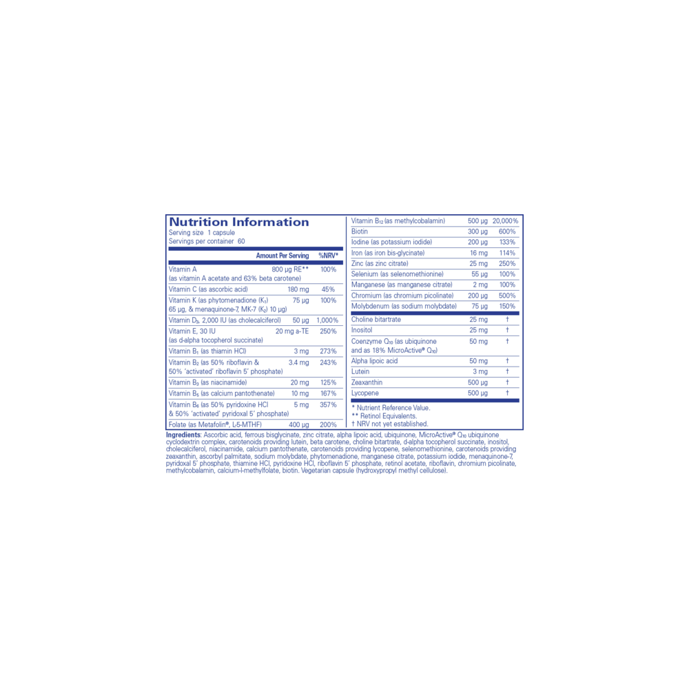 <table align="center" border="1" cellpadding="3" cellspacing="0" height="176" width="488"> <tbody> <tr valign="top"> <td colspan="3"><b>Nutritional Information: Food supplement</b></td> </tr> <tr valign="top"> <td colspan="3"><strong>Serving Size: </strong>1 capsule</td> </tr> <tr valign="top"> <td colspan="3"><strong>Servings Per Container:</strong> 60</td> </tr> <tr valign="top"> <td width="70%"></td> <td width="15%">Amount Per Serving</td> <td width="15%">%RI*</td> </tr> <tr> <td>Vitamin A, 3750IU (as vitamin A acetate and 73% beta carotene)</td> <td>800 μg RE</td> <td>100%</td> </tr> <tr> <td>Vitamin C (as ascorbic acid)</td> <td>180mg</td> <td>225%</td> </tr> <tr> <td>Vitamin K (as phytomenadione (K1) 65μg, & menaquinone-7, MK-7 (K2) 10μg)</td> <td>75μg</td> <td>100%</td> </tr> <tr> <td>Vitamin D3, 2000IU (as cholecalciferol)</td> <td>50μg</td> <td>1000%</td> </tr> <tr> <td>Vitamin E, 30IU (as d-alpha-tocopherol succinate)</td> <td>20mg a-TE</td> <td>167%</td> </tr> <tr> <td>Vitamin B1 (as thiamin HCl)</td> <td>3mg</td> <td>273%</td> </tr> <tr> <td>Vitamin B2 (as 50% riboflavin & 50% 'activated' riboflavin 5' phosphate)</td> <td>3.4mg</td> <td>243%</td> </tr> <tr> <td>Vitamin B3 (as niacinamide)</td> <td>20mg</td> <td>125%</td> </tr> <tr> <td>Vitamin B5 (as calcium pantothenate)</td> <td>10mg</td> <td>167%</td> </tr> <tr> <td>Vitamin B6 (as 50% pyridoxine HCl & 50% 'activated' pyridoxal 5' phosphate)</td> <td>5mg</td> <td>357%</td> </tr> <tr> <td>Folate (as Metafolin, L-5-MTHF)</td> <td>400μg</td> <td>200%</td> </tr> <tr> <td>Vitamin B12 (as methylcobalamin)</td> <td>500μg</td> <td>20000%</td> </tr> <tr> <td>Biotin</td> <td>300μg</td> <td>600%</td> </tr> <tr> <td>Iodine (as potassium iodide)</td> <td>200μg</td> <td>133%</td> </tr> <tr> <td>Iron (as iron bis-glycinate)</td> <td>16mg</td> <td>114%</td> </tr> <tr> <td>Zinc (as zinc citrate)</td> <td>25mg</td> <td>250%</td> </tr> <tr> <td>Selenium (as selenomethionine)</td> <td>55μg</td> <td>100%</td> </tr> <tr> <td>Manganese (as manganese citrate)</td> <td>2mg</td> <td>100%</td> </tr> <tr> <td>Chromium (as chromium picolinate)</td> <td>200μg</td> <td>500%</td> </tr> <tr> <td>Molybdenum (as sodium molybdate)</td> <td>75μg</td> <td>150%</td> </tr> <tr> <td>Choline bitartrate</td> <td>25mg</td> <td>†</td> </tr> <tr> <td>Inositol</td> <td>25mg</td> <td>†</td> </tr> <tr> <td>Coenzyme Q10 (CoQ10) (as ubiquinone & MicroActive Q10)</td> <td>50mg</td> <td>†</td> </tr> <tr> <td>Alpha lipoic acid</td> <td>50mg</td> <td>†</td> </tr> <tr> <td>Lutein</td> <td>3mg</td> <td>†</td> </tr> <tr> <td>Zeaxanthin</td> <td>500μg</td> <td>†</td> </tr> <tr> <td>Lycopene</td> <td>500μg</td> <td>†</td> </tr> <tr valign="top"> <td colspan="3">† Reference Intake not established.</td> </tr> </tbody></table><h3>Ingredients</h3><p>Ubiquinone, MicroActive® Q10 ubiquinone cyclodextrin complex, carotenoids providing lutein, choline bitartrate, d-alpha tocopherol succinate, inositol, cholecalciferol, niacinamide, beta carotene, calcium pantothenate, carotenoids providing lycopene, selenomethionine, carotenoids providing zeaxanthin, ascorbyl palmitate, menaquinone-7, phytomenadione, manganese citrate, potassium iodide, thiamine HCl, retinol acetate, pyridoxal 5' phosphate, pyridoxine HCl, riboflavin 5' phosphate, riboflavin, chromium picolinate, methylcobalamin, calcium-l-methylfolate, biotin, sodium molybdate, ascorbic acid, ferrous bisglycinate, zinc citrate, alpha lipoic acid, Vegetarian capsule (hydroxypropyl methyl cellulose)</p>