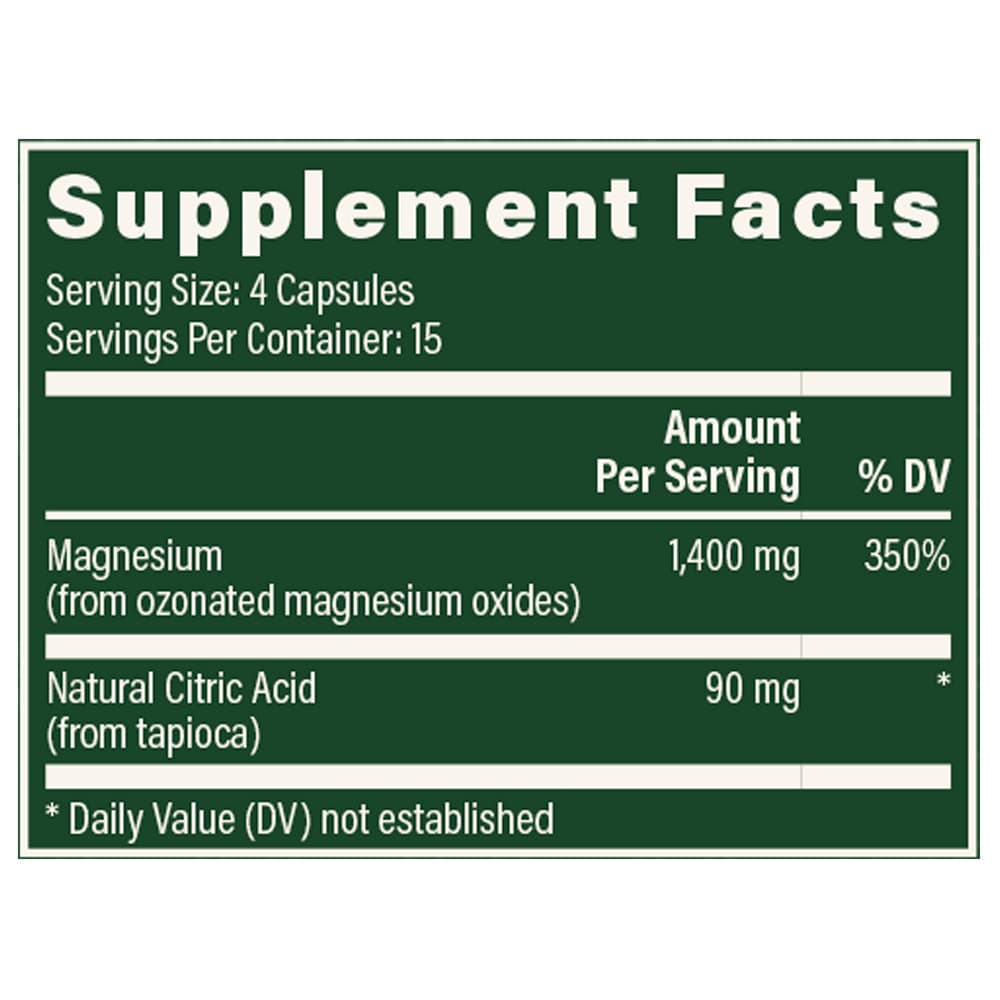 <table align='center' border='1' cellpadding='3' cellspacing='0'> <tbody> <tr valign='top'> <td colspan='3'><b>Nutritional Information: Food supplement, Minerals</b></td> </tr> <tr valign='top'> <td colspan='3'><strong>Serving Size:</strong> 4 Capsules</td> </tr> <tr valign='top'> <td colspan='3'><strong>Servings Per Container:</strong> 15</td> </tr> <tr valign='top'> <td width='70%'></td> <td width='15%'>Amount Per Serving</td> <td width='15%'>% Reference Intake (RI)</td> </tr> <tr> <td>Magnesium (from ozonated magnesium oxides)</td> <td>1,400 mg</td> <td>350%</td> </tr> <tr> <td>Natural Citric Acid (from tapioca)</td> <td>90 mg</td> <td>†</td> </tr> <tr valign='top'> <td colspan='3'>† Reference Intake not established.</td> </tr> </tbody></table><h3>Ingredients</h3><p>Magnesium (from ozonated magnesium oxides), Natural Citric Acid (from tapioca), Vegetable capsule (cellulose), Organic gum acacia</p>