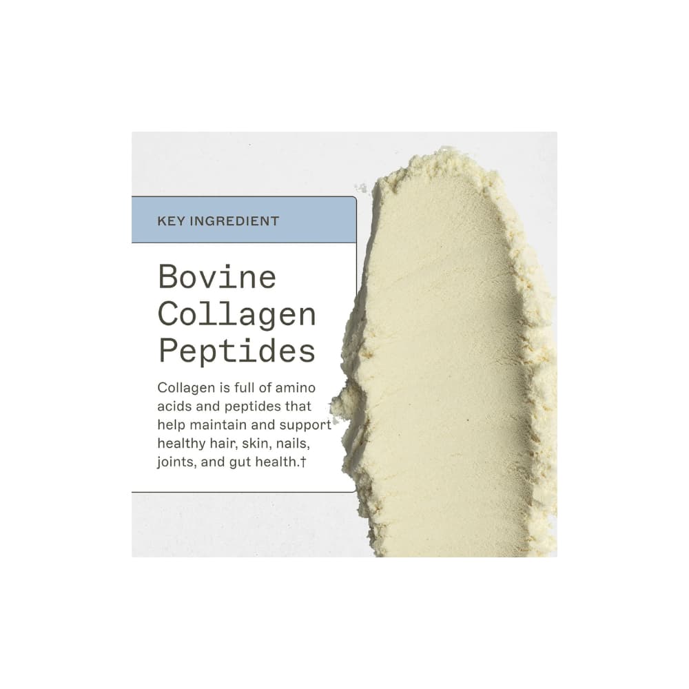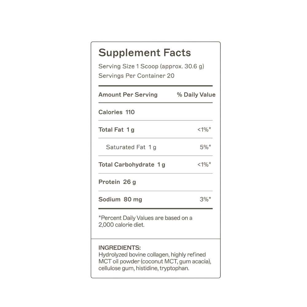 <table align='center' border='1' cellpadding='3' cellspacing='0'> <tbody> <tr valign='top'> <td colspan='3'><b>Nutritional Information: Food supplement</b></td> </tr> <tr valign='top'> <td colspan='3'><strong>Serving Size: </strong>1 Scoop (approx. 30.6 g)</td> </tr> <tr valign='top'> <td colspan='3'><strong>Servings Per Container:</strong> 20</td> </tr> <tr valign='top'> <td width='70%'> </td> <td width='15%'>Amount Per Serving</td> <td width='15%'>% Reference Intake (RI)*</td> </tr> <tr> <td>Calories</td> <td>110</td> <td>—</td> </tr> <tr> <td>Total Fat</td> <td><1 g</td> <td><1%</td> </tr> <tr> <td> Saturated Fat</td> <td>—</td> <td>5%</td> </tr> <tr> <td>Total Carbohydrate</td> <td><1 g</td> <td><1%</td> </tr> <tr> <td>Protein</td> <td>26 g</td> <td>—</td> </tr> <tr> <td>Sodium</td> <td>80 mg</td> <td>3%</td> </tr> <tr valign='top'> <td colspan='3'>*Percent Daily Values are based on a 2,000 calorie diet.</td> </tr> </tbody></table><h3>Ingredients</h3><p>Hydrolyzed bovine collagen, highly refined MCT oil powder (coconut MCT, gum acacia), cellulose gum, histidine, tryptophan.</p>