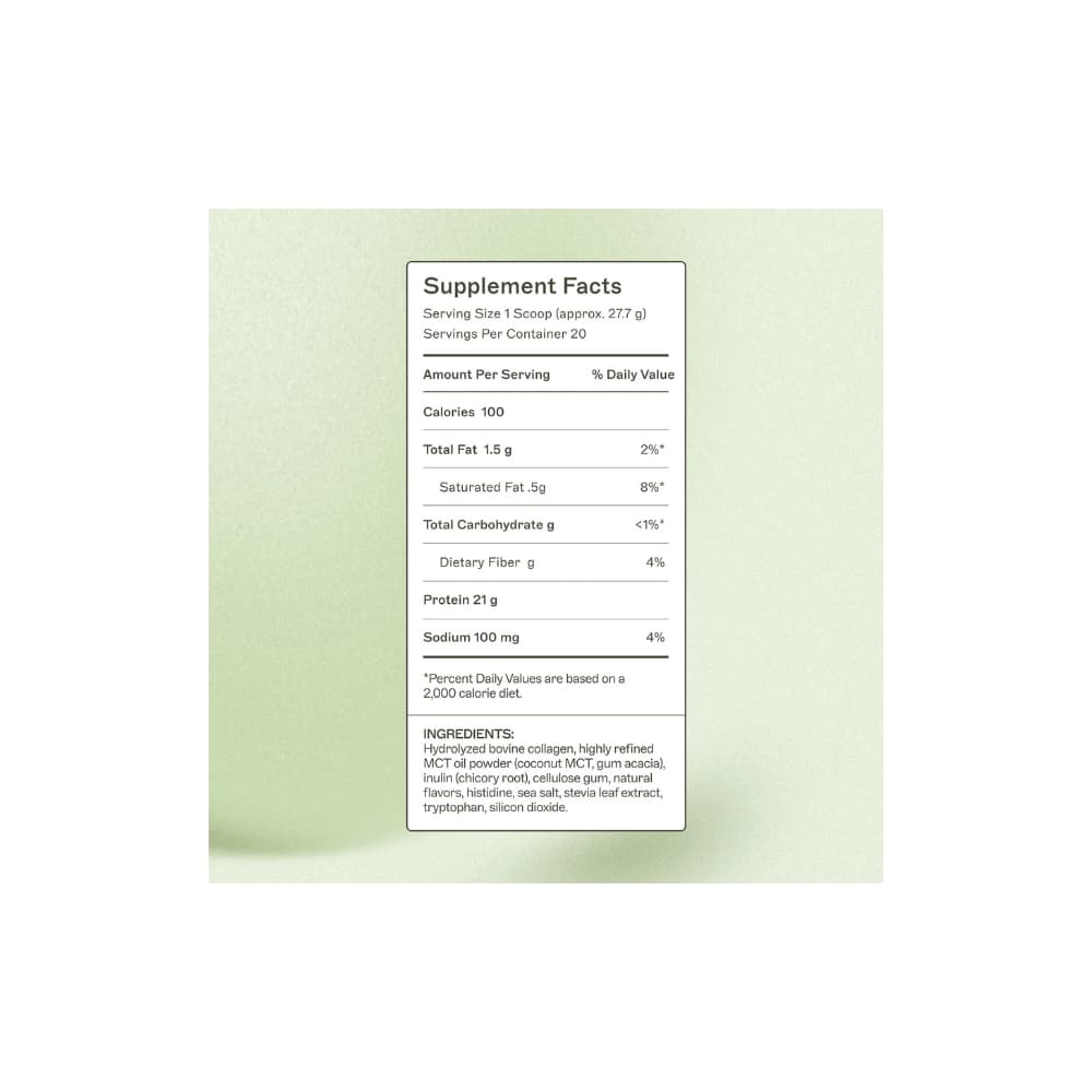 <table align='center' border='1' cellpadding='3' cellspacing='0'> <tbody> <tr valign='top'> <td colspan='3'><b>Nutritional Information: Food supplement</b></td> </tr> <tr valign='top'> <td colspan='3'><strong>Serving Size: </strong>1 Scoop (approx. 27.7 g)</td> </tr> <tr valign='top'> <td colspan='3'><strong>Servings Per Container:</strong> 20</td> </tr> <tr valign='top'> <td width='70%'> </td> <td width='15%'>Amount Per Serving</td> <td width='15%'>% Reference Intake (RI)*</td> </tr> <tr> <td>Calories</td> <td>100</td> <td>—</td> </tr> <tr> <td>Total Fat</td> <td>1.5 g</td> <td>2%</td> </tr> <tr> <td>&nbsp;&nbsp;&nbsp;&nbsp;Saturated Fat</td> <td>0.5 g</td> <td>8%</td> </tr> <tr> <td>Total Carbohydrate</td> <td>—</td> <td>&lt;1%</td> </tr> <tr> <td>&nbsp;&nbsp;&nbsp;&nbsp;Dietary Fiber</td> <td>—</td> <td>4%</td> </tr> <tr> <td>Protein</td> <td>21 g</td> <td>—</td> </tr> <tr> <td>Sodium</td> <td>100 mg</td> <td>4%</td> </tr> <tr valign='top'> <td colspan='3'>*Percent Daily Values are based on a 2,000 calorie diet.</td> </tr> </tbody></table><h3>Ingredients</h3><p>Hydrolyzed bovine collagen, highly refined MCT oil powder (coconut MCT, gum acacia), inulin (chicory root), cellulose gum, natural flavors, histidine, sea salt, stevia leaf extract, tryptophan, silicon dioxide.</p>