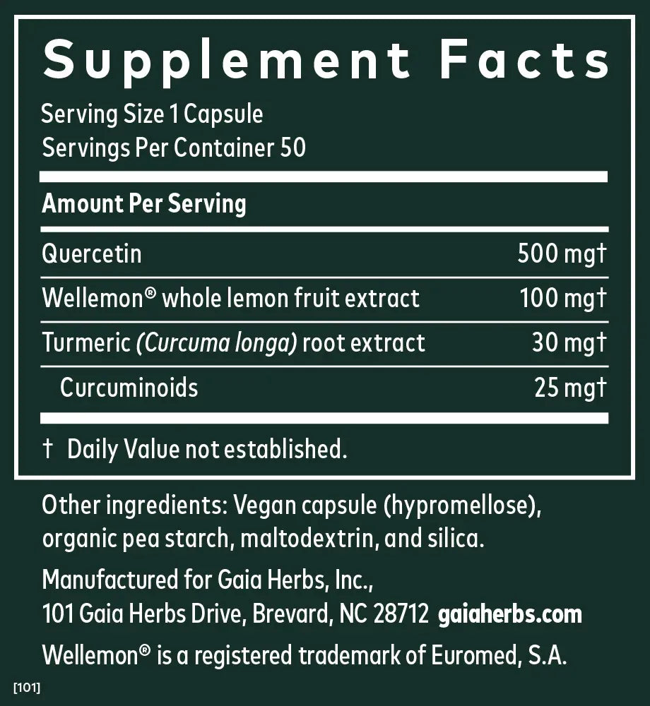 <table align="center" border="1" cellpadding="3" cellspacing="0"> <tbody> <tr valign="top"> <td colspan="3"><b>Nutritional Information: Food Supplement, Herbs</b></td> </tr> <tr valign="top"> <td colspan="3"><strong>Serving Size: </strong>1 capsule</td> </tr> <tr valign="top"> <td colspan="3"><strong>Servings Per Container:</strong> 100</td> </tr> <tr valign="top"> <td width="70%"> </td> <td width="15%">Amount Per Serving</td> <td width="15%">% Reference Intake (RI)*</td> </tr> <tr> <td>Quercetin</td> <td>500 mg</td> <td>†</td> </tr> <tr> <td>Wellemon® whole lemon fruit extract</td> <td>100 mg</td> <td>†</td> </tr> <tr> <td>Turmeric (Curcuma longa) root extract</td> <td>30 mg</td> <td>†</td> </tr> <tr> <td>Of Which: Curcuminoids</td> <td>25 mg</td> <td>†</td> </tr> <tr valign="top"> <td colspan="3">† Reference Intake not established.</td> </tr> </tbody></table><h3>Ingredients</h3><p>Quercetin, Wellemon® whole lemon fruit extract, Turmeric (Curcuma longa) root extract, Curcuminoids, Vegan capsule (hypromellose), organic pea starch, maltodextrin, silica</p>