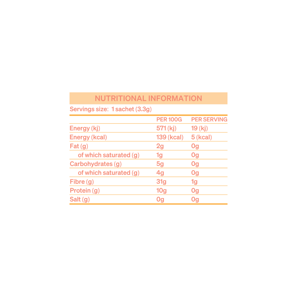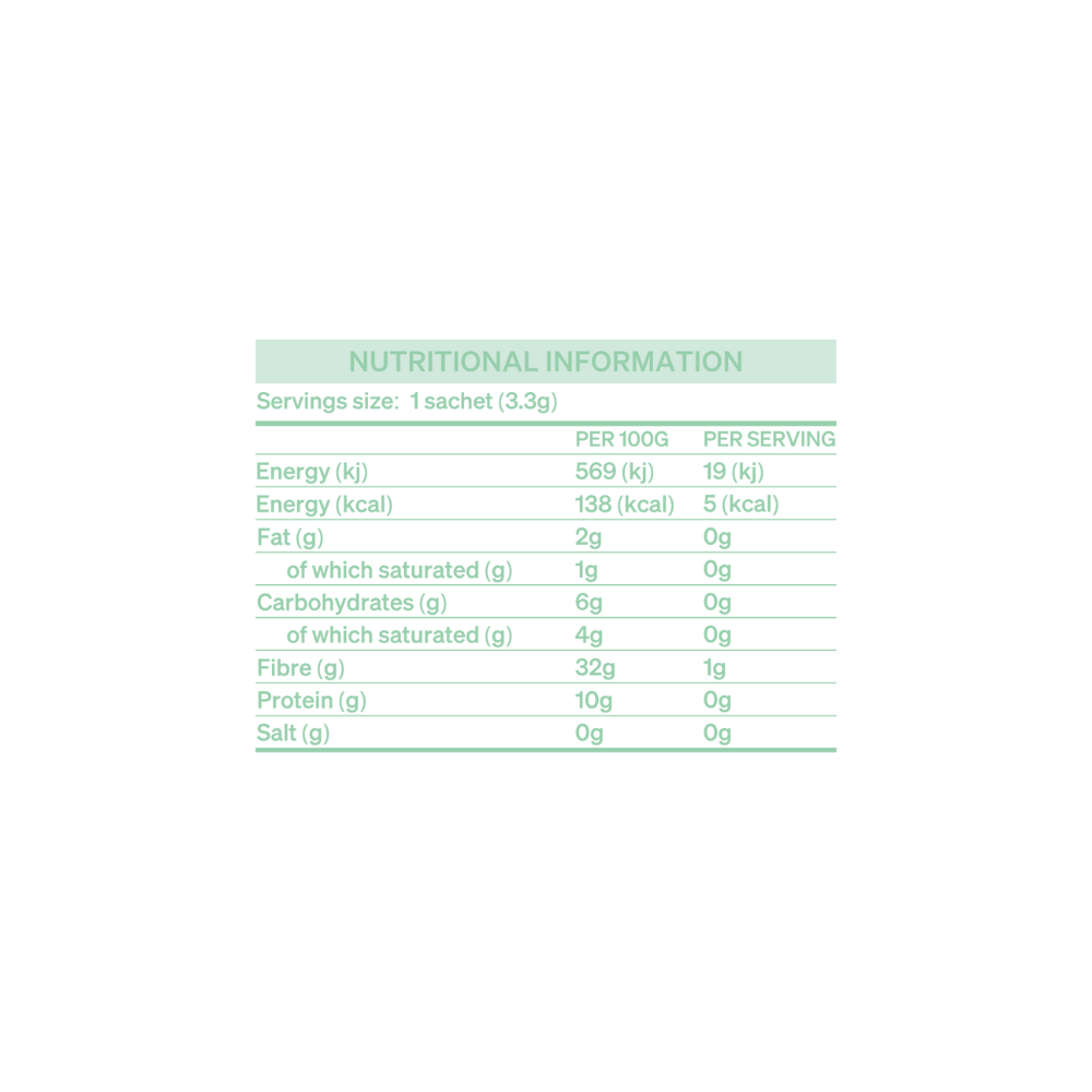 <p><strong>Mojo coffee </strong>– barista-style coffee, organic dual-extracted cordyceps mushroom extract, siberian ginseng, natural flavouring.</p><table align="center" border="1" cellpadding="3" cellspacing="0"> <tbody> <tr valign="top"> <td colspan="3"><b>Nutritional Information</b></td> </tr> <tr valign="top"> <td colspan="3"><strong>Serving Size: </strong> 1 Sachet (3.3g)</td> </tr> <tr valign="top"> <td colspan="3"><strong>Servings Per Box:</strong> 4</td> </tr> <tr valign="top"> <td width="70%"> </td> <td width="15%"><strong>Amount Per 100g </strong></td> <td width="15%"><b>Per portion</b></td> </tr> <tr> <td>Energy (kj)</td> <td>568.7</td> <td>18.8</td> </tr> <tr> <td>Energy (kcal)</td> <td>138.0</td> <td>4.6</td> </tr> <tr> <td>Fat (g)</td> <td>1.5</td> <td>0.1</td> </tr> <tr> <td> of which saturated (g)</td> <td>0.5</td> <td>0.0</td> </tr> <tr> <td>Carbohydrates (g)</td> <td>5.7</td> <td>0.2</td> </tr> <tr> <td> of which sugars (g)</td> <td>3.5</td> <td>0.1</td> </tr> <tr> <td>Fibre (g)</td> <td>31.6</td> <td>1.0</td> </tr> <tr> <td>Protein (g)</td> <td>9.6</td> <td>0.3</td> </tr> <tr> <td>Salt</td> <td>0.0</td> <td>0.0</td> </tr> </tbody></table><p> </p><p><strong>Flow coffee</strong> – barista-style coffee, organic dual-extracted lions mane mushroom extract, rhodiola rosea extract, natural flavouring</p><table align="center" border="1" cellpadding="3" cellspacing="0"> <tbody> <tr valign="top"> <td colspan="3"><b>Nutritional Information</b></td> </tr> <tr valign="top"> <td colspan="3"><strong>Serving Size: </strong> 1 Sachet (3.5g)</td> </tr> <tr valign="top"> <td colspan="3"><strong>Servings Per Box:</strong> 4</td> </tr> <tr valign="top"> <td width="70%"> </td> <td width="15%"><strong>Amount Per 100g </strong></td> <td width="15%"><b>Per portion</b></td> </tr> <tr> <td>Energy (kj)</td> <td>570.8</td> <td>20.0</td> </tr> <tr> <td>Energy (kcal)</td> <td>138.5</td> <td>4.8</td> </tr> <tr> <td>Fat (g)</td> <td>1.7</td> <td>0.1</td> </tr> <tr> <td> of which saturated (g)</td> <td>0.5</td> <td>0.0</td> </tr> <tr> <td>Carbohydrates (g)</td> <td>5.2</td> <td>0.2</td> </tr> <tr> <td> of which sugars (g)</td> <td>3.5</td> <td>0.1</td> </tr> <tr> <td>Fibre (g)</td> <td>30.9</td> <td>1.1</td> </tr> <tr> <td>Protein (g)</td> <td>10.1</td> <td>0.4</td> </tr> <tr> <td>Salt</td> <td>0.0</td> <td>0.0</td> </tr> </tbody></table><p> </p><p><strong>Zen coffee</strong> - Barista-style coffee, organic ashwagandha root extract, natural flavouring.</p><table align="center" border="1" cellpadding="3" cellspacing="0"> <tbody> <tr valign="top"> <td colspan="3"><b>Nutritional Information</b></td> </tr> <tr valign="top"> <td colspan="3"><strong>Serving Size: </strong> 1 Sachet (3.2g)</td> </tr> <tr valign="top"> <td colspan="3"><strong>Servings Per Box:</strong> 4</td> </tr> <tr valign="top"> <td width="70%"> </td> <td width="15%"><strong>Amount Per 100g </strong></td> <td width="15%"><b>Per portion</b></td> </tr> <tr> <td>Energy (kj)</td> <td>576.5</td> <td>18.4</td> </tr> <tr> <td>Energy (kcal)</td> <td>140.0</td> <td>4.5</td> </tr> <tr> <td>Fat (g)</td> <td>1.3</td> <td>0.0</td> </tr> <tr> <td> of which saturated (g)</td> <td>0.6</td> <td>0.0</td> </tr> <tr> <td>Carbohydrates (g)</td> <td>6.5</td> <td>0.2</td> </tr> <tr> <td> of which sugars (g)</td> <td>3.9</td> <td>0.1</td> </tr> <tr> <td>Fibre (g)</td> <td>33.7</td> <td>1.1</td> </tr> <tr> <td>Protein (g)</td> <td>8.7</td> <td>0.3</td> </tr> <tr> <td>Salt</td> <td>0.0</td> <td>0.0</td> </tr> </tbody></table><p> </p>