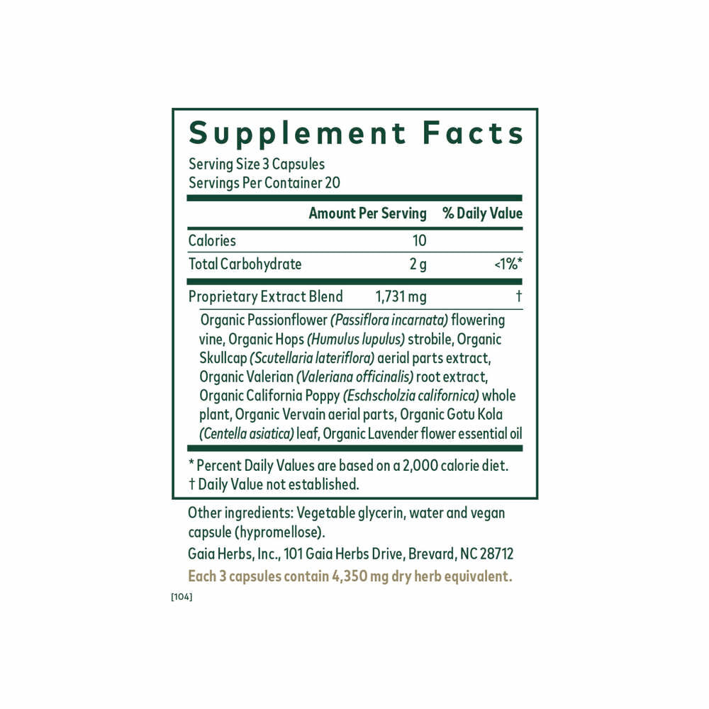 <table align="center" border="1" cellpadding="3" cellspacing="0"> <tbody> <tr valign="top"> <td colspan="3"><b>Nutritional Information: Food supplement</b></td> </tr> <tr valign="top"> <td colspan="3"><strong>Serving Size:</strong> 3 Capsules</td> </tr> <tr valign="top"> <td colspan="3"><strong>Servings Per Container:</strong> 20</td> </tr> <tr valign="top"> <td width="70%"></td> <td width="15%">Amount Per Serving</td> <td width="15%">% Reference Intake (RI)</td> </tr> <tr> <td>Proprietary Extract Blend<br>Organic Passionflower (Passiflora incarnata) flowering vine, Organic Hops (Humulus lupulus) strobile, Organic Skullcap (Scutellaria lateriflora) aerial parts extract, Organic Valerian (Valeriana officinalis) root extract, Organic California Poppy (Eschscholzia californica) whole plant, Organic Vervain aerial parts, Organic Gotu Kola (Centella asiatica) leaf, Organic Lavender flower essential oil.</td> <td>1731 mg</td> <td>†</td> </tr> <tr> <td>Total Carbohydrate</td> <td>2 g</td> <td>&lt;1%</td> </tr> <tr> <td>Calories</td> <td>10</td> <td>†</td> </tr> <tr valign="top"> <td colspan="3">† Reference Intake not established.</td> </tr> </tbody></table><h3>Ingredients</h3><p>Organic Passionflower, Organic Hops, Organic Skullcap, Organic Valerian, Organic California Poppy, Organic Vervain, Organic Gotu Kola, Organic Lavender, Vegetable glycerin, Water, Vegan capsule (hypromellose)</p>