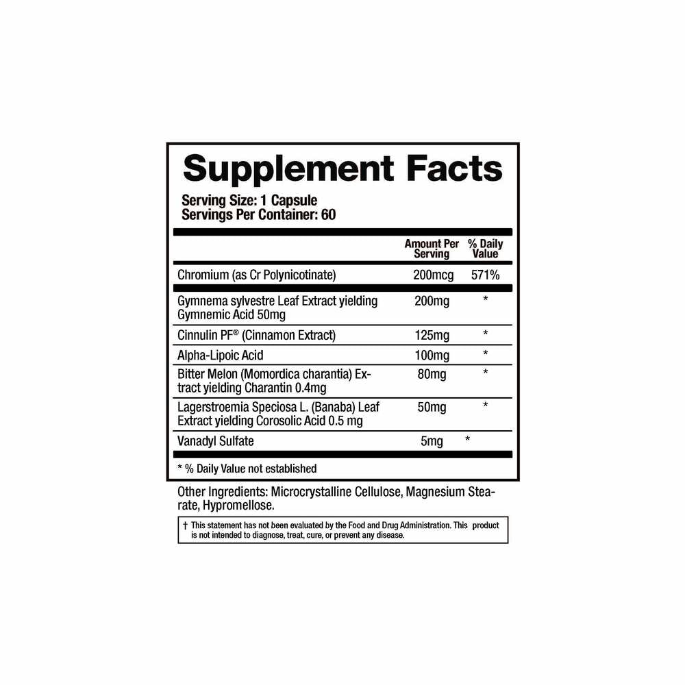 <table align="center" border="1" cellpadding="3" cellspacing="0"> <tbody> <tr valign="top"> <td colspan="3"><b>Nutritional Information: Food supplement</b></td> </tr> <tr valign="top"> <td colspan="3"><strong>Serving Size: </strong>1</td> </tr> <tr valign="top"> <td colspan="3"><strong>Servings Per Container:</strong> 60</td> </tr> <tr valign="top"> <td width="70%"> </td> <td width="15%">Amount Per Serving</td> <td width="15%">% RI*</td> </tr> <tr> <td>Chromium (as Cr Polynicotinate)</td> <td>200 mcg</td> <td>500</td> </tr> <tr> <td>Gymnema sylvestre Leaf Extract</td> <td>200 mg</td> <td>†</td> </tr> <tr> <td>Yielding Gymnemic Acid</td> <td>50 mg</td> <td>†</td> </tr> <tr> <td>Cinnulin PF® (Cinnamon Extract)</td> <td>125 mg</td> <td>†</td> </tr> <tr> <td>Alpha-Lipoic Acid</td> <td>100 mg</td> <td>†</td> </tr> <tr> <td>Bitter Melon (Momordica charantia) Extract</td> <td>80 mg</td> <td>†</td> </tr> <tr> <td>Yielding Charantin</td> <td>0.4 mg</td> <td>†</td> </tr> <tr> <td>Lagerstroemia speciosa L. (Banaba) Leaf Extract</td> <td>50 mg</td> <td>†</td> </tr> <tr> <td>Yielding Corosolic Acid</td> <td>0.5 mg</td> <td>†</td> </tr> <tr> <td>Vanadyl Sulfate</td> <td>5 mg</td> <td>†</td> </tr> <tr valign="top"> <td colspan="3">† Reference Intake not established.</td> </tr> </tbody></table><h3>Ingredients</h3><p>Vegetable cellulose (capsule), rice flour, vegetarian leucine, Chromium (as Cr Polynicotinate), Gymnema sylvestre Leaf Extract, Yielding Gymnemic Acid, Cinnulin PF® (Cinnamon Extract), Alpha-Lipoic Acid, Bitter Melon (Momordica charantia) Extract, Yielding Charantin, Lagerstroemia speciosa L. (Banaba) Leaf Extract, Yielding Corosolic Acid, Vanadyl Sulfate</p>